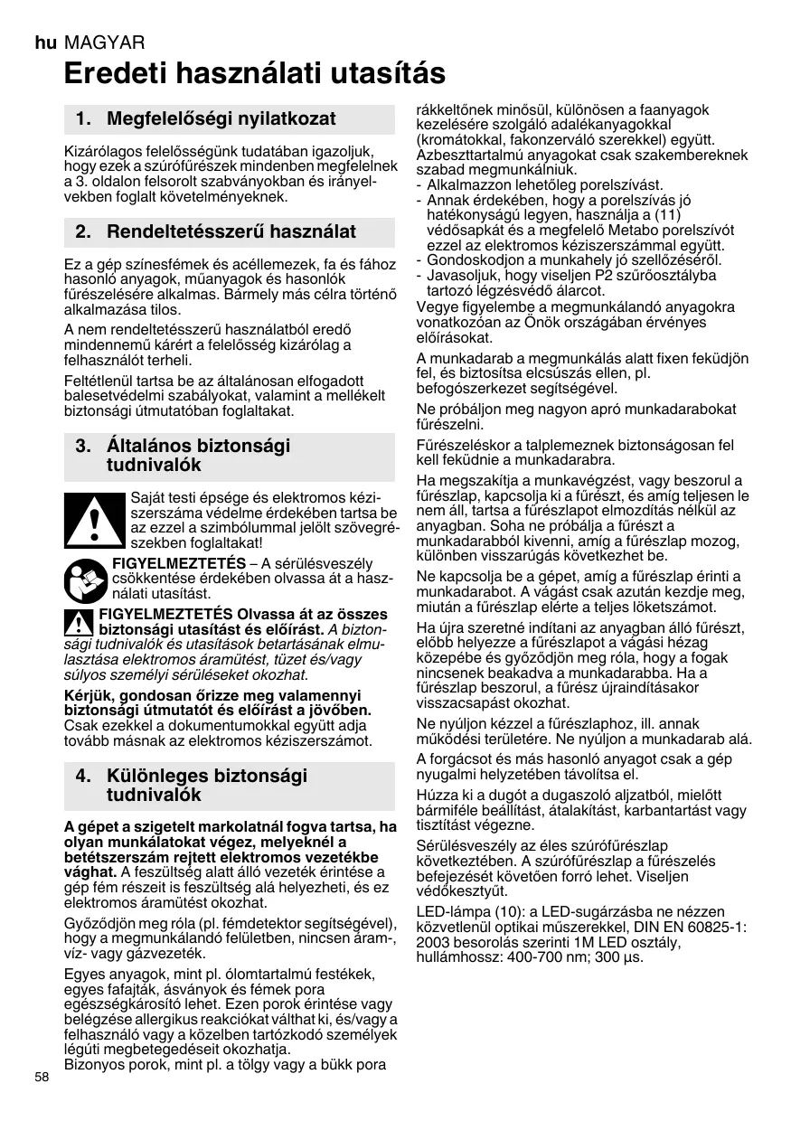 Sajat testi epsege es elektromos kéziszerszama védelme érdekében tartsa be az ezzel a szimbolummal jalölt szövegrészekben foggaltakat!