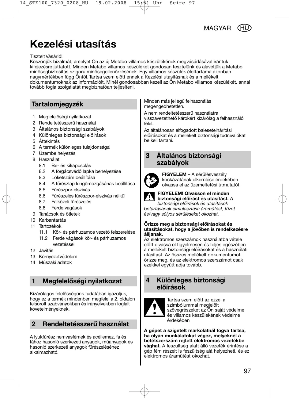 15:51 Uhr Seite 97 MAGYAR Kezelési utasítás Tisztelt Vásárló! Köszönjük bizalmát, amelyet Ön az új Metabo villamos készülékének megvásárlásával irántuk kifejezésre juttatott. Minden Metabo villamos készüléket gondosan tesztelünk és alávetjük a Metabo minőségbiztosítás szigorú minőségellenőrzésének. Egy villamos készülék élettartama azonban nagymértékben függ Öntől. Tartsa szem előtt ennek a Kezelési utasításnak és a mellékelt dokumentumoknak az információit. Minél gondosabban kezeli az Ön Metabo villamos készülékét, annál tovább fogja szolgálatát megbízhatóan teljesíteni. Tartalomjegyzék