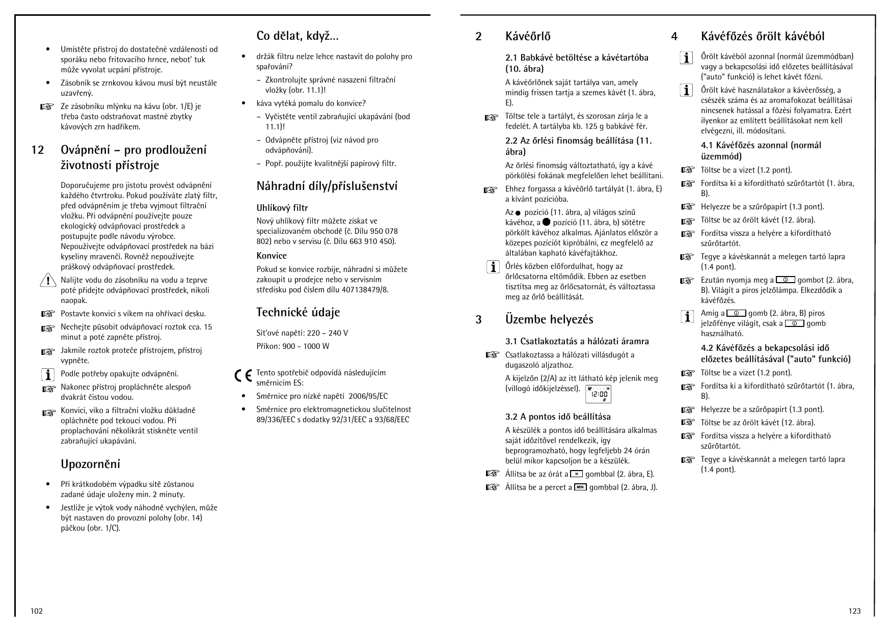 ési finom ság be ál ítása (11. ábra) – Popř. použ ijte k val itnější papírový fil tr. Az őrl ési finom ság vál toztath ató, így a k ávé pörk öl ési fok ának m e gfe l őe n l e h e t be ál ítani. Náh radní díl y/přísl uše nství Az pozíció (11. ábra, a) vil ágos színű k ávéh oz, a pozíció (11. ábra, b) sötétre pörk öl t k ávéh oz al k al m as. Ajánl atos e l őször a k öze pe s pozíciót k ipróbál ni, e z m e gfe l őaz tal ában k aph ató k ávéfajták h oz. Nový uh l ík ový fil tr m ůž e te získ at ve spe cial izovaném obch odě (č. D íl u 9 50 078