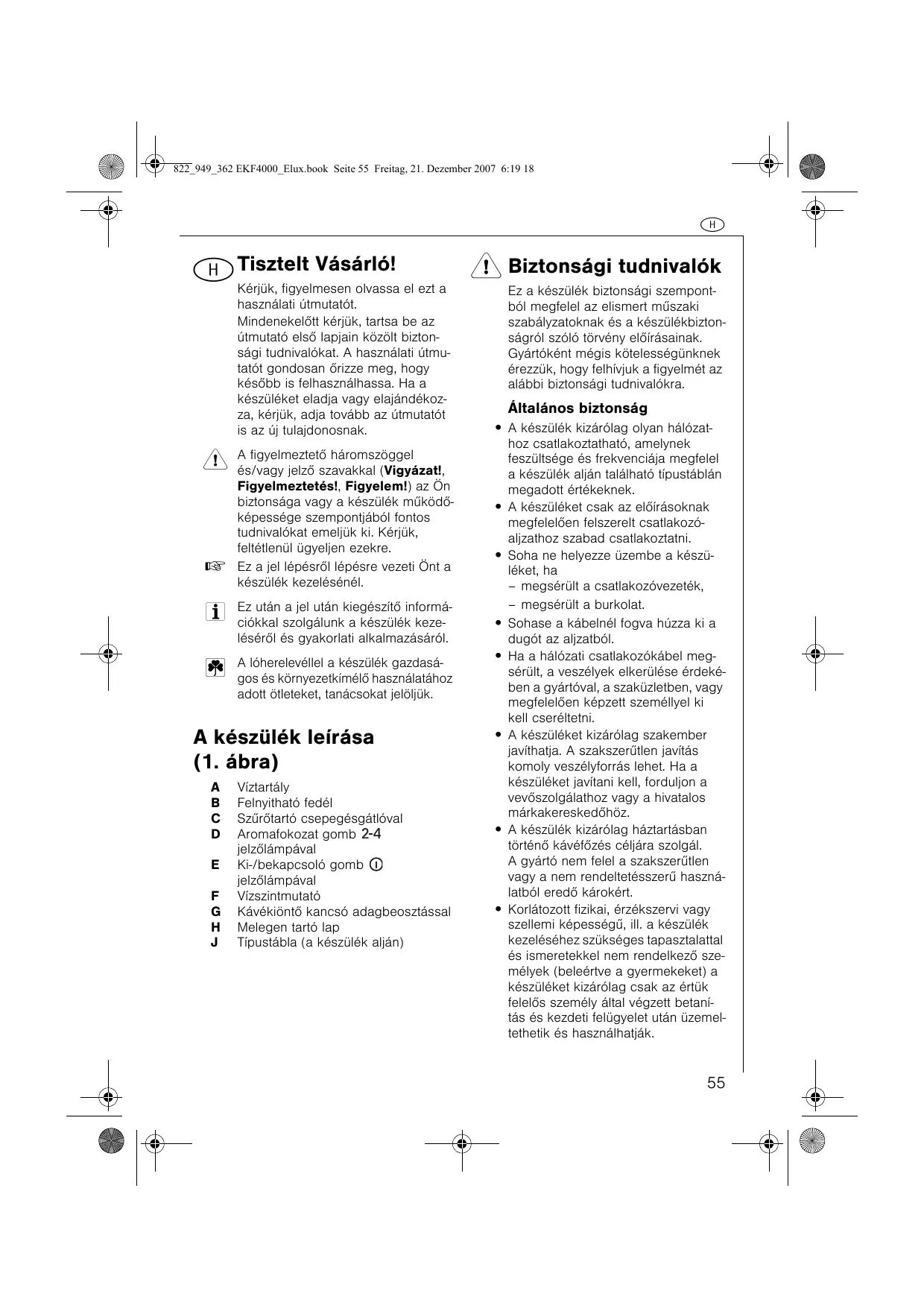 C1 PT RIZ 949_362 EKF4000_Elux.book Seite 55 Freitag, 21. Dezember 2007 6:19 18 D Tisztelt Väsäérlé! Kériük, figyelmesen oivassa el ezt a hasznälati ütmutatôt. Mindenekelôtt kérjük, tartsa be az ütmutaté elsé lapjain këzôlt bizton- sägi tudnivalékat, À hasznélati ütmu- tatôt gondosan 6rizze meg, hogy késôbb is felhasznäihassa. Ha a készüléket eladja vagy elajändékoz- za, kérjük, adja tovébb az dtmutatôt is az üj tulajdonosnak. A figyelmezteté häromszôggel és/vagy jelz6 szavakkal (Vigyäzat!, Figyelmeztetés!, Figyelem!) az Ün biztonsäga vagy a készülék mükôdé- képessége szempontjäbél fontos tudnivalékat emeljük ki. Kérjük, feltétlenül ügyelien ezekre. Ez a jel lépésrél lépésre vezeti Ünt a készülék kezelésénél. Ez utén a jel utän kiegészité informé- ciékkal szolgélunk a készülék keze- lésérél és gyakorlati alkalmazäsärél. A léherelevéllel a készülék gazdasé- gos és kômyezetkimélé hasznélatähoz adott ôtleteket, tanäcsokat jelôliük. A készülék leiräsa (1. âbra) A Viztartäly B Felnyithaté fedél C Szürôtart csepegésgätloval D Aromafokozat gomb 2-4 jelzélämpäval E Ki-/bekapcsolé gomb © jelzélémpäval F _ Vizszintmutaté G Kävékiônt6 kancsé adagbeosztässal H Melegen tart lap J Tipustäbla (a készülék aljän) /\ Biztonsägi tudnivalék Ez a készülék biztonsägi szempont- bél megfelel az elismert müszaki szabälyzatoknak és a készülékbizton- ségrél szôlé tôrvény eléirésainak Gyärtéként mégis kôtelességünknek érezzük, hogy felhiviuk a figyelmét az aläbbi biztonsägi tudnivalékra. Âltalänos biztonsäg À készülék kizrélag olyan hälézat- hoz csatlakoztathaté, amelynek feszültsége és frekvenciäja megfelel a készülék aljän talälhat tipustéblän megadott értékeknek. A készüléket csak az el6ir4soknak megfeleléen felszerelt csatlakozé- alzathoz szabad csatlakoztatni. Soha ne helyezze üzembe a készü- léket, ha — megsérült a csatlakozévezeték, - megsérült a burkolat. Sohase a käbelnél fogva hüzza ki a dugôt az aljzatbôl. Ha a hälézati csatlakozékäbel meg- sérült, a veszélyek elkerülése érdeké- ben a gvértéval, a szaküzletben, vagy megfeleléen képzett személlyel ki kell cseréltetni. A készüléket kizärélag szakember javithatia. À szakszerütlen javits komoly veszélyforrés lehet. Ha a készüléket javitani kell, forduljon a vevészolgälathoz vagy a hivatalos märkakeresked6hüz. A készülék kizärélag häztartäsban tôrténé kävétézés céljéra szolgäl. À gvärté nem felel a szakszerütlen vagy a nem rendeltetésszerû haszné- latbôl ered6 kärokért. Korlétozott fizikai, érzékszervi vagy szellemi képességi, ill. a Készülék kezeléséhez szükséges tapasztalattal és ismeretekkel nem rendelkezé sze- mélyek (beleérive a ayermekeket) a készüléket kizärélag csak az értük felelés személy éltal végzett betani- tés és kezdeti felügyelet utän üzemel- tethetik és hasznälhatjäk.
