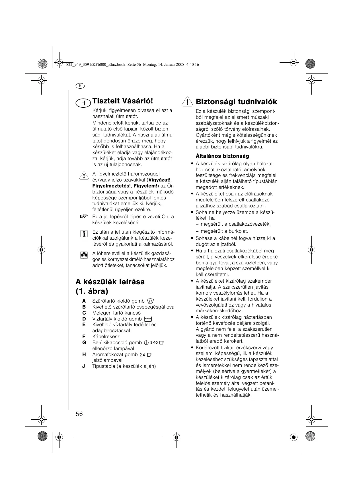- Korlátozott fizikai, érzékszervi vagy szellemi képességû, ill. a készülék kezeléséhez szükséges tapasztalattal és ismeretekkel nem rendelkezõ személyek (beleértve a gyermekeket) a készüléket kizárólag csak az értük felelõs személy által végzett betanítás és kezdeti felügyelet után üzemeltethetik és használhatják. 822_949_359 EKF6000_Elux.book Seite 57 Montag, 14. Januar 2008 4:40 16