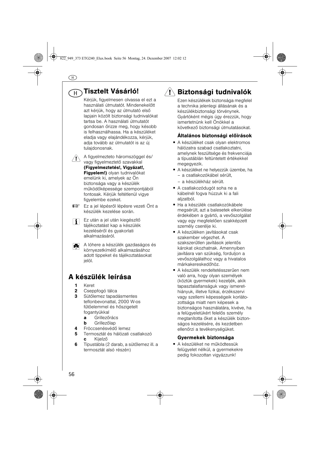 - A készüléket ne mûködtessük felügyelet nélkül, a gyermekekre pedig fokozottan vigyázzunk! 822_949_373 ETG240_Elux.book Seite 57 Montag, 24. Dezember 2007 12:02 12