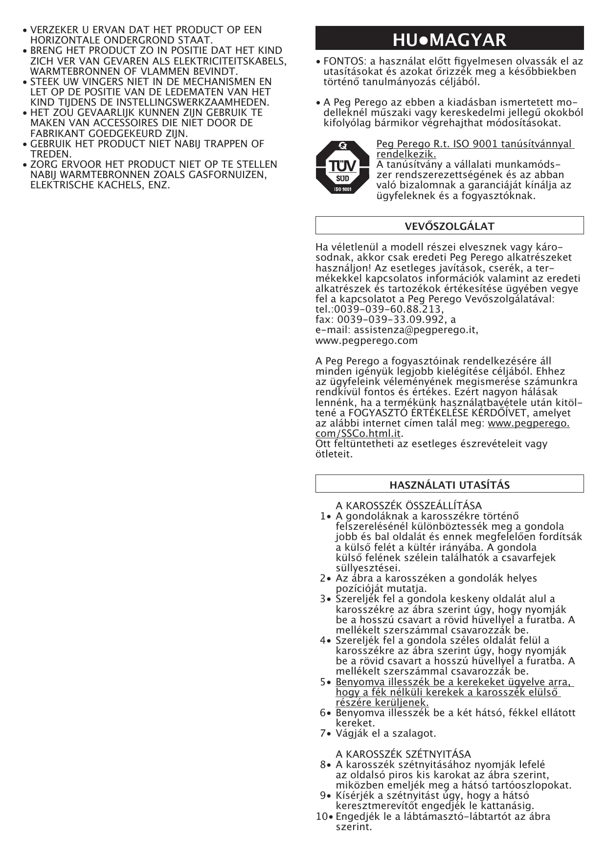 PEG PEREGO pourra apporter à tout moment des modifications aux modèles décrits dans ce manuel. Peg Perego S.p.A. bénéficie de la certification ISO 9001. La certification assure aux clients et aux consommateurs une garantie de transparence et de confiance dans la façon dont travaille lʼentreprise. SERVICE DʼASSISTANCE En cas de perte ou dommage fortuit de pièces du modèle, utilisez exclusivement les pièces de rechange originales Peg Perego. Pour les éventuelles réparations, substitutions, informations sur les produits, la vente de pièces de rechange originales et dʼaccessoires, contactez le Service dʼassistance Peg-Perego: tél.: 0039-039-60.88.213 fax: 0039-039-33.09.992 e-mail: assistenza@pegperego.it www.pegperego.com Peg Perego est à la disposition de ses consommateurs pour satisfaire au mieux toutes leurs exigences. À cette fin, connaître lʼavis de nos clients est pour nous extrêmement important et précieux. Nous vous saurions donc gré, après avoir utilisé lʼun de nos produits, de bien vouloir remplir le QUESTIONNAIRE SATISFACTION DU CONSOMMATEUR que vous trouverez sur Internet à lʼadresse suivante: “www.pegperego.com/SSCo.html.en-UK”, et de nous faire vos éventuelles observations ou suggestions. NOTICE DʼEMPLOI ASSEMBLAGE DE LA CHAISE HAUTE 1• Pour monter les gondoles sur la chaise haute, faire attention au sens des gondoles droite et gauche et placer lʼextérieur des gondoles à lʼextérieur. Les extrémités de la partie extérieure des gondoles sont dotées dʼun trou pour la tête des vis. 2• La figure représente la position correcte des gondoles sur la chaise haute. 3• Monter la partie étroite de la gondole en bas de la chaise haute, comme indiqué sur la figure, en insérant dans le trou la vis longue avec la douille courte. Visser avec lʼoutil fourni. 4• Monter la partie large de la gondole en haut de la chaise haute, comme indiqué sur la figure, en insérant dans le trou la vis courte avec la douille longue. Visser avec lʼoutil fourni. 5• Appliquer par pression les roues sans freins à l'avant de la chaise haute. 6• Appliquer les deux roues arrière avec freins. 7• Couper le collier. OUVERTURE DE LA CHAISE HAUTE 8• Pour ouvrir la chaise haute, pousser les doigts rouges latéraux vers le bas, comme indiqué sur la figure, en faisant levier sur les montants arrière. 9• Accompagner lʼouverture en abaissant le barreau arrière jusquʼau clic. 10• Abaisser le repose-pied, comme indiqué sur la figure. 11• Au déballage, la position du siège de la chaise haute nʼest pas adaptée à lʼemploi (position