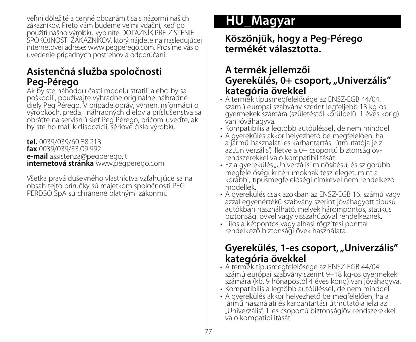 tel. 0039/039/60.88.213 fax 0039/039/33.09.992 e-mail assistenza@pegperego.it internetes weboldal www.pegperego.com A kezelési útmutató tartalmával kapcsolatos minden szellemi tulajdonjog a PEG PEREGO S.p.A. tulajdonát képezi, és az érvényes jogszabályok hatálya alá tartozik. 82