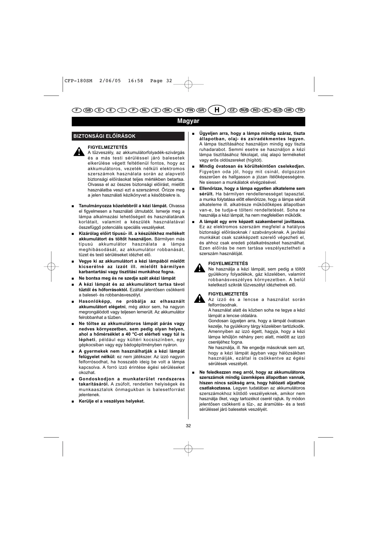 FIGYELMEZTETÉS Ne hasznälja a kézi lämpät, sem pedig a tôltôt gyälékony folyadékok, géz kôzelében, valamint robbanäsveszélyes kérnyezetben. À belül Keletkezé szikrk tézveszélyt idézhetnek elô.