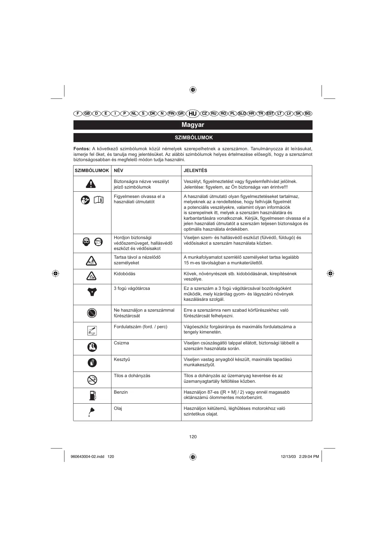 Magyar SZIMBÓLUMOK Fontos: A következő szimbólumok közül némelyek szerepelhetnek a szerszámon. Tanulmányozza át leírásukat, ismerje fel őket, és tanulja meg jelentésüket. Az alábbi szimbólumok helyes értelmezése elősegíti, hogy a szerszámot biztonságosabban és megfelelő módon tudja használni. SZIMBÓLUMOK NÉV JELENTÉS Biztonságra nézve veszélyt jelző szimbólumok Veszélyt, figyelmeztetést vagy figyelemfelhívást jelölnek. Jelentése: figyelem, az Ön biztonsága van érintve!!! Figyelmesen olvassa el a használati útmutatót A használati útmutató olyan figyelmeztetéseket tartalmaz, melyeknek az a rendeltetése, hogy felhívják figyelmét a potenciális veszélyekre, valamint olyan információk is szerepelnek itt, melyek a szerszám használatára és karbantartására vonatkoznak. Kérjük, figyelmesen olvassa el a jelen használati útmutatót a szerszám teljesen biztonságos és optimális használata érdekében. Hordjon biztonsági védőszemüveget, hallásvédő eszközt és védősisakot Viseljen szem- és hallásvédő eszközt (fülvédő, füldugó) és védősisakot a szerszám használata közben. Tartsa távol a nézelődő személyeket A munkafolyamatot szemlélő személyeket tartsa legalább 15 m-es távolságban a munkaterülettől. Kidobódás Kövek, növényrészek stb. kidobódásának, kirepítésének veszélye. 3 fogú vágótárcsa Ez a szerszám a 3 fogú vágótárcsával bozótvágóként működik, mely kizárólag gyom- és lágyszárú növények kaszálására szolgál. Ne használjon a szerszámmal fűrésztárcsát Erre a szerszámra nem szabad körfűrészekhez való fűrésztárcsát felhelyezni. Fordulatszám (ford. / perc) Vágóeszköz forgásiránya és maximális fordulatszáma a tengely kimenetén. Csizma Viseljen csúszásgátló talppal ellátott, biztonsági lábbelit a szerszám használata során. Kesztyű Viseljen vastag anyagból készült, maximális tapadású munkakesztyűt. Tilos a dohányzás Tilos a dohányzás az üzemanyag keverése és az üzemanyagtartály feltöltése közben. Benzin Használjon 87-es ([R + M] / 2) vagy ennél magasabb oktánszámú ólommentes motorbenzint. Olaj Használjon kétütemű, léghűtéses motorokhoz való szintetikus olajat.