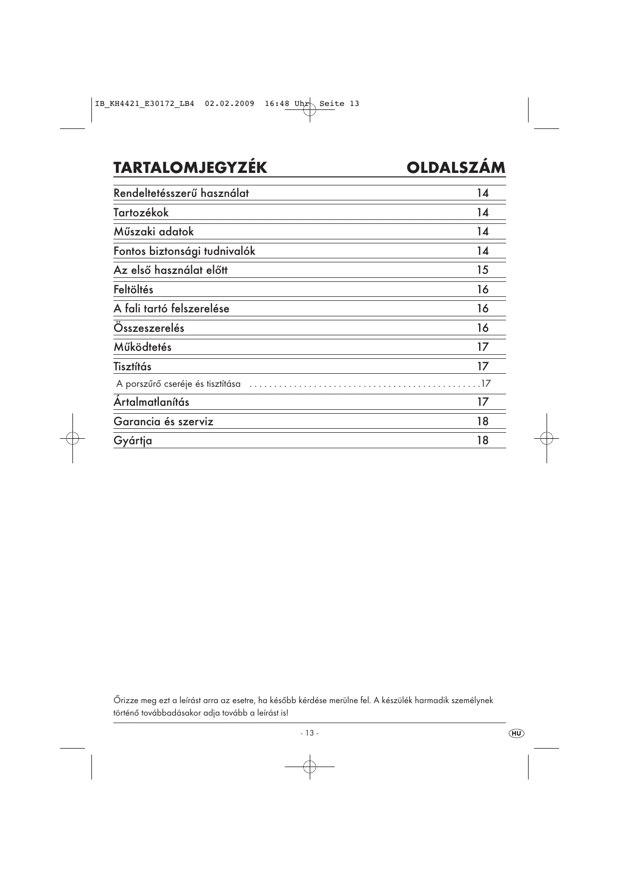 HASZNÁLATI ÚTMUTATÓ KH 4421 SILVERCREST