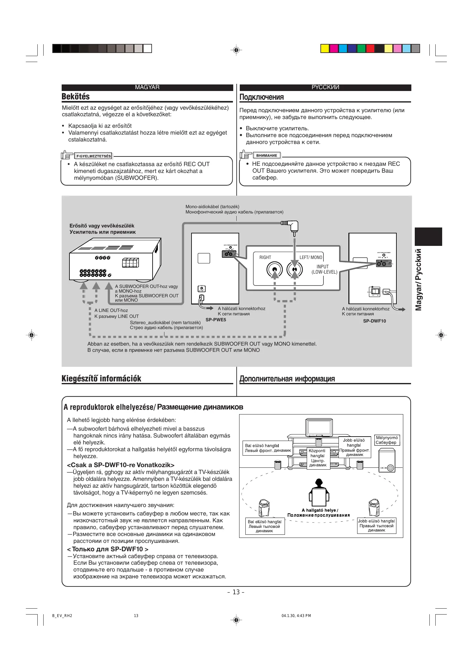 MAGYAR M Szerelési utasitäs + Hogy a burkolat ne deformälédjon vagy ne fakuljon ki, a készüléket ne helyezze olyan helyre, ahol kôzvetlen napsütésnek vagy nagy nedvességnek lenne kitéve. Ne helyezze légkondicionälé berendezés kôzelébe sem. A reproduktorok rezgése zajt (howling) välthat ki. A hangszérékat a lehet6 legmesszebbre helyezze el az âtjäszo berendezéstôl. A készülék helyének kivälasztäsa elôtt vegye fontolâsra az esetleges fôldrengést vagy egyéb mechanikus râzkédäsokat, és a készüléket alaposan rôgzitse. A tuner szignälja a hangszéro kôzelében züghat. llyen esetben a hangszérôt helyezze a tunertôl messzebbre, vegy klülsé anténät hasznäljon a tuner szignäljänak javitâsära és a reproduktor ältal kivältott interferencia megszüntetésére. Ez a készülék ellektromagnetikus ärnyékolässal van ellétva, hogy a TV berendezésen a szinek ne deformälédjanak. Amennyiben a készülék helytelen médon van felszerelve a szinek deformäciéja bekôvetkezhet. Ezért a készülék felszerelésénél tartsa szemelôtt a kôvetkezé utasitäsokat: — Ha TV készülék kôzelébe helyezi, kapcsolja ki a TV hélézati kapvsoléjät, vagy hüzza ki a dugaszät a készülék felszerelése elôtt. Ezt kôvetéen legaläbb 30 percet värjon, maïjd a TV- készüléket üjra kapcsolja be. Néhäny TV — készülék a rendesen végrehaijtott szerelés esetében is negativ hatäsnak lehetnek kitéve. llyen esetben a hangszérékat a TV - készülék 61 nagyobb tâvolsägra helyezze. <Csak a SP-DWF10-re Vonatkozik> + Ha a TV képe mozog, tâvolitsa el ezt az egységet a TV-t6l és helyezze el valamely olyan helyen, ahol mâr nem zavarja a képet. BH À napi hasznälatra vonatkozé utasitâsok + Külsé karbantartäs A készülék bepiszkolt burkolatät és az elülsé irânyité lapjät szäraz puha ronggyal tôrôlje le. Nagyobb mértékü piszok esetén a készüléket nedves ronggyal vagy semleges tisztitészerbe märtott ronggyal, majd szäraz ronggyal tôrôlje le. + Az akusztikai tulajdonsägok javitâsa Amennyiben a hangszérék szilârd fal, üvegaijté, stb. Felé vannak forditva, ajanlatos ezeket a felületeket hangelnyelé anyaggal, példâul nehéz függônnyel lefedni, hogy visszhang vagy älléhullämok (standing waves) ne jôhessen létre. HA készülék tartozékainak ellenbrzése Ellenérizze, hogy a kôvetkez6 tartozékok megvannak-e. A zärôjelben szereplé szämok a darabszämra vonatkoznak. + Mono-audiokäbel (1) Amennyiben ez az alkatrész hiänyzik, rôgtôn forduljon az üzleti partneréhez. PYCCKHU M MpeaocrepekeHUA, KACAIÏOLIUECA YCTAHOBKH + _ Ana npenoTspaueHua aeopmauuu nu o6ecuBe4uBaHun Kopnyca He yCTAHABAUBAATE TO OA NPAMBIMU CONHEHHEIMA NyXAMU UM B MECTAX C HPESMEPHOË BNAKHOCTHIO, A TAKKE OKONO OTAYLUUH KOHAMLUOHEPOB. Bu6pauuA FPOMKOrOBOPATENA MOXKET BHISBATE 3ABLIBAHUA. YcTaHoBuTe 2TO YCTPOÂCTBO KaK MOXHO AaNBLLE OT NPOUrPEIBATENA. Mpu 8kI60pe MeCTa ANA YCTAHOBKH YCTPOÂCTBA YAUTEIBAÜTE BO3MOXHOCTb 3EMIATPECEHUA UM APyTOTO CHNIBHOTO TONHKA 4 BbIGUPAÂTE MECTO TLATENIEHO. Mpu ycTaHogke 3TOro YCTPOÂCTBA OKONO TIOHepa NpAEM MOXET CONPOBOKAATECA NOMEXAMA UM LuurEHUEM. B 3TOM chyuae yBenu4bTe PACCTOAHUE MEXAY TIOHEPOM 4 STUM YCTPOCTBOM NM BOCNONLSYATECL BHELUHEÜ AHTEHHOË, ynyALualoLen Ka4eCTBO NPYEMA. Bo u36exaHue uckaxeHuï u306paXKeHUA Ha 3KpaHe TeAeBH30pa 2TO YCTPOÂCTBO O60PyAOBAHO MArHATHOË sauuToÿ. Te He mMeHee, npu HenpaBUnbHOË YCTAHOBKE OHO MOXET BbISBATE HCKAKEHHE LBETOB. lp yCTaHOBKe yCTPOCTBA O6PATUTE BHAMAHHUE Ha CNenyIOLLEE. — Mpu pasmeuenuu Toro yCTpoÂCTBA oKono TeneBy30pa nepea Ha4arloM YCTAHOBKU OTKMIOHUTE NEPEKNIOHATENE NUTAHUA TENEBU3OPA UM BbIKTIOHUTE EFO 13 PO3ETKU. Mepea noBTopHEIM BKNIOHEHAEM NUTAHHA TenleBU30pa BEIXAMTE KaK MAHUMYM 30 MUHYT. Aaxe HecMoTpA Ha BBInonHeHUe NPABEAEHHPIX BEILIE MEP, HA 2kpaHax HEKOTOPBIX TENEBH30POB MOFYT 6biTE nomexu. B TOM chyuae yCTaHOBUTe 2TO YCTPOÂCTBO NOANbLLE OT TeneBu30pa. <Tonkko ana SP-DWF10 > + Ecnu meer mecTo apoxaHue TB skpaHa, To yaanuTe AMHaMMK OT TefBH30PA, 4 HAÏAUTE ANA HeTO Apyroe MECTO, rae apoxaHue He 6yneT HAGNIOAATECA. EH lpeaocrepexeHyñ, KaCAOLUECA 9KCNJIVATALUU + Monnepxanue xopomero BHelIHero BUAa YCTPOCTBa Npu sarpasHeHuu Kopnyca un naHenu ynpaBñneHUA NPOTPUTE nOBEPXHOCTb MArKOù cyxoùû TKAHbIO. Npu CHNbHOM 3aTPA3HEHUU CMOHUTE TKAHE B BOJE USM B pacTBope HeÂTpañbHOro HUCTALJETO CPEACTBA 4 YAañUTe rpA3b. SaTeM NPOTPUTE CYXOÙ TKAHbIO. Ynyawenue 3ByKoBOro nonn Ecnu amHamuku HanpaBñeHbi Ha KanUTANbHy1O CTEHY ANA Ha CTeKNAHHy10 ABePLY, Mbl peKoMeHAyeM Bam B Lennx npeaoT8paleHuA 06pa3OBAHUA CTORAUX BONH OÔLUATE CTEHbI 3ByKONOTOLLAIOLUM MATEPHANOM, HANPAMEP, NOBECUB HA HUX TONCTHIE 3AHABECKH. HE Nposepka KOMnNeKTAUUA Y6eauTecs B TOM, 4TO Bi nonyaunu cneayIoLue npuHagnexHocTu. B cKo6Kax yKasaHO Konu4eCTBO nphHaqnekHOCTEÏ. + Monobonuueckuü ayauo kaGenk (1) Ecnu yKasaHHAA BbILLE NPHHAANEKHOCTE OTCYTCTBYET, HesaMeqnyTenbHO 06paTUTeCE K Baluemy aunepy. Tartalom Conepxanue Vigyäzat, figyelmeztetések, stb. … ”] | B_EV_RH2 7 MpeaynpexaeHyA, npeaocTepeKEHUA 4 Apyroe … Moakniouenun AononurenbHan yHpopmauua … Skcnnyarauua 04.130, 4:43 PM CORRE CI