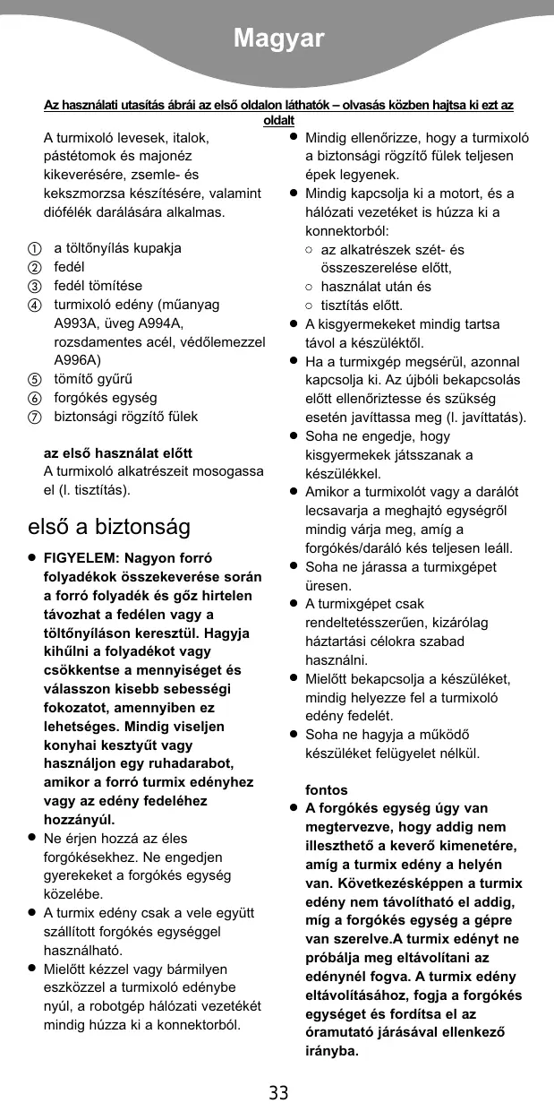 Mindig ellenòrizze, hogy a turmixoló a biztonsági rögzítò fülek teljesen épek legyenek. Mindig kapcsolja ki a motort, és a hálózati vezetéket is húzza ki a konnektorból: ● az alkatrészek szét- és összeszerelése elòtt, ● használat után és ● tisztítás elòtt. A kisgyermekeket mindig tartsa távol a készüléktòl. Ha a turmixgép megsérül, azonnal kapcsolja ki. Az újbóli bekapcsolás elòtt ellenòriztesse és szükség esetén javíttassa meg (l. javíttatás). Soha ne engedje, hogy kisgyermekek játsszanak a készülékkel. Amikor a turmixolót vagy a darálót lecsavarja a meghajtó egységròl mindig várja meg, amíg a forgókés/daráló kés teljesen leáll. Soha ne járassa a turmixgépet üresen. A turmixgépet csak rendeltetésszerûen, kizárólag háztartási célokra szabad használni. Mielőtt bekapcsolja a készüléket, mindig helyezze fel a turmixoló edény fedelét. Soha ne hagyja a működő készüléket felügyelet nélkül. fontos A forgókés egység úgy van megtervezve, hogy addig nem illeszthető a keverő kimenetére, amíg a turmix edény a helyén van. Következésképpen a turmix edény nem távolítható el addig, míg a forgókés egység a gépre van szerelve.A turmix edényt ne próbálja meg eltávolítani az edénynél fogva. A turmix edény eltávolításához, fogja a forgókés egységet és fordítsa el az óramutató járásával ellenkező irányba.