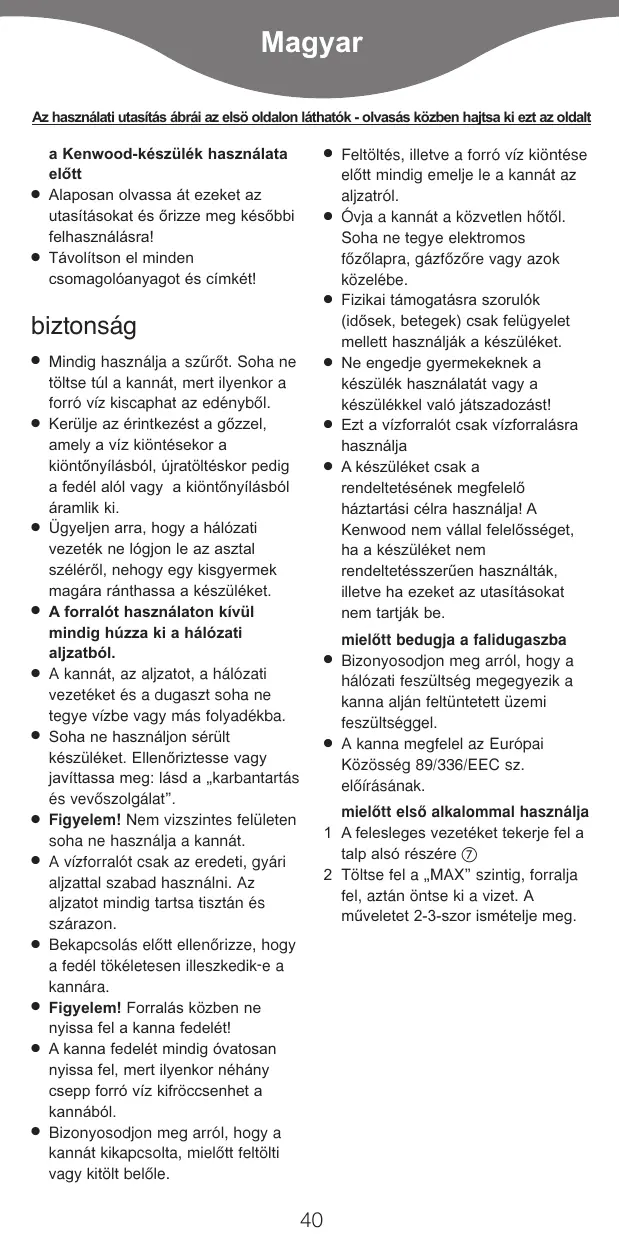 Feltöltés, illetve a forró víz kiöntése elŒtt mindig emelje le a kannát az aljzatról. Óvja a kannát a közvetlen hŒtŒl. Soha ne tegye elektromos fŒzŒlapra, gázfŒzŒre vagy azok közelébe. Fizikai támogatásra szorulók (idősek, betegek) csak felügyelet mellett használják a készüléket. Ne engedje gyermekeknek a készülék használatát vagy a készülékkel való játszadozást! Ezt a vízforralót csak vízforralásra használja A készüléket csak a rendeltetésének megfelelő háztartási célra használja! A Kenwood nem vállal felelősséget, ha a készüléket nem rendeltetésszerűen használták, illetve ha ezeket az utasításokat nem tartják be. mielŒtt bedugja a falidugaszba Bizonyosodjon meg arról, hogy a hálózati feszültség megegyezik a kanna alján feltüntetett üzemi feszültséggel. A kanna megfelel az Európai Közösség 89/336/EEC sz. elŒírásának. mielŒtt elsŒ alkalommal használja 1 A felesleges vezetéket tekerje fel a talp alsó részére 2 Töltse fel a „MAX” szintig, forralja fel, aztán öntse ki a vizet. A mûveletet 2-3-szor ismételje meg.