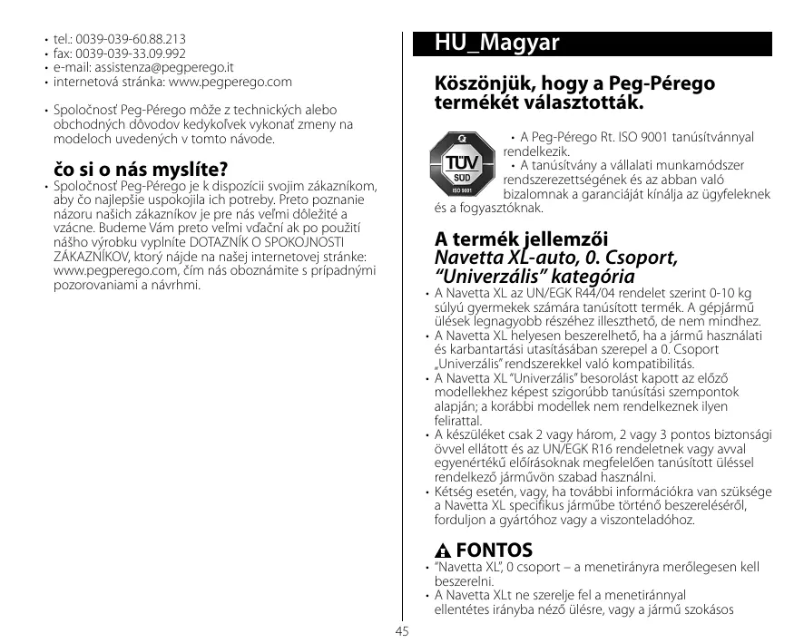 • A Navetta XL az UN/EGK R44/04 rendelet szerint 0-10 kg súlyú gyermekek számára tanúsított termék. A gépjármű ülések legnagyobb részéhez illeszthető, de nem mindhez. • A Navetta XL helyesen beszerelhető, ha a jármű használati és karbantartási utasításában szerepel a 0. Csoport „Univerzális” rendszerekkel való kompatibilitás. • A Navetta XL “Univerzális” besorolást kapott az előző modellekhez képest szigorúbb tanúsítási szempontok alapján; a korábbi modellek nem rendelkeznek ilyen felirattal. • A készüléket csak 2 vagy három, 2 vagy 3 pontos biztonsági övvel ellátott és az UN/EGK R16 rendeletnek vagy avval egyenértékű előírásoknak megfelelően tanúsított üléssel rendelkező járművön szabad használni. • Kétség esetén, vagy, ha további információkra van szüksége a Navetta XL specifikus járműbe történő beszereléséről, forduljon a gyártóhoz vagy a viszonteladóhoz.