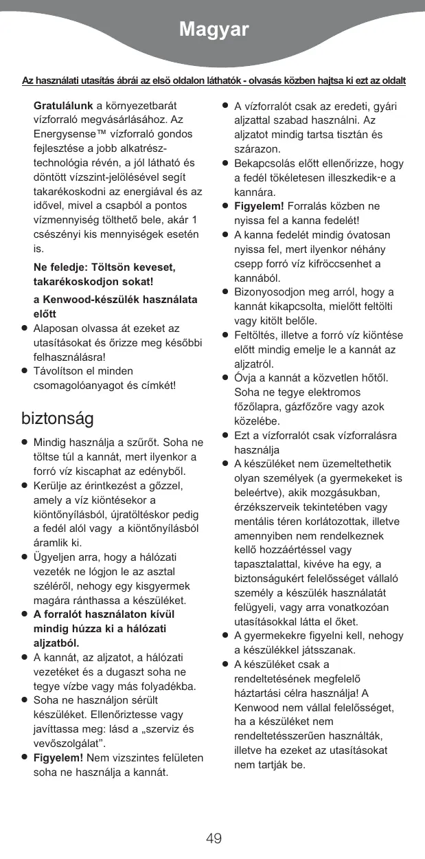A vízforralót csak az eredeti, gyári aljzattal szabad használni. Az aljzatot mindig tartsa tisztán és szárazon. Bekapcsolás elŒtt ellenŒrizze, hogy a fedél tökéletesen illeszkedik-e a kannára. Figyelem! Forralás közben ne nyissa fel a kanna fedelét! A kanna fedelét mindig óvatosan nyissa fel, mert ilyenkor néhány csepp forró víz kifröccsenhet a kannából. Bizonyosodjon meg arról, hogy a kannát kikapcsolta, mielŒtt feltölti vagy kitölt belŒle. Feltöltés, illetve a forró víz kiöntése elŒtt mindig emelje le a kannát az aljzatról. Óvja a kannát a közvetlen hŒtŒl. Soha ne tegye elektromos fŒzŒlapra, gázfŒzŒre vagy azok közelébe. Ezt a vízforralót csak vízforralásra használja A készüléket nem üzemeltethetik olyan személyek (a gyermekeket is beleértve), akik mozgásukban, érzékszerveik tekintetében vagy mentális téren korlátozottak, illetve amennyiben nem rendelkeznek kellő hozzáértéssel vagy tapasztalattal, kivéve ha egy, a biztonságukért felelősséget vállaló személy a készülék használatát felügyeli, vagy arra vonatkozóan utasításokkal látta el őket. A gyermekekre figyelni kell, nehogy a készülékkel játsszanak. A készüléket csak a rendeltetésének megfelelő háztartási célra használja! A Kenwood nem vállal felelősséget, ha a készüléket nem rendeltetésszerűen használták, illetve ha ezeket az utasításokat nem tartják be.