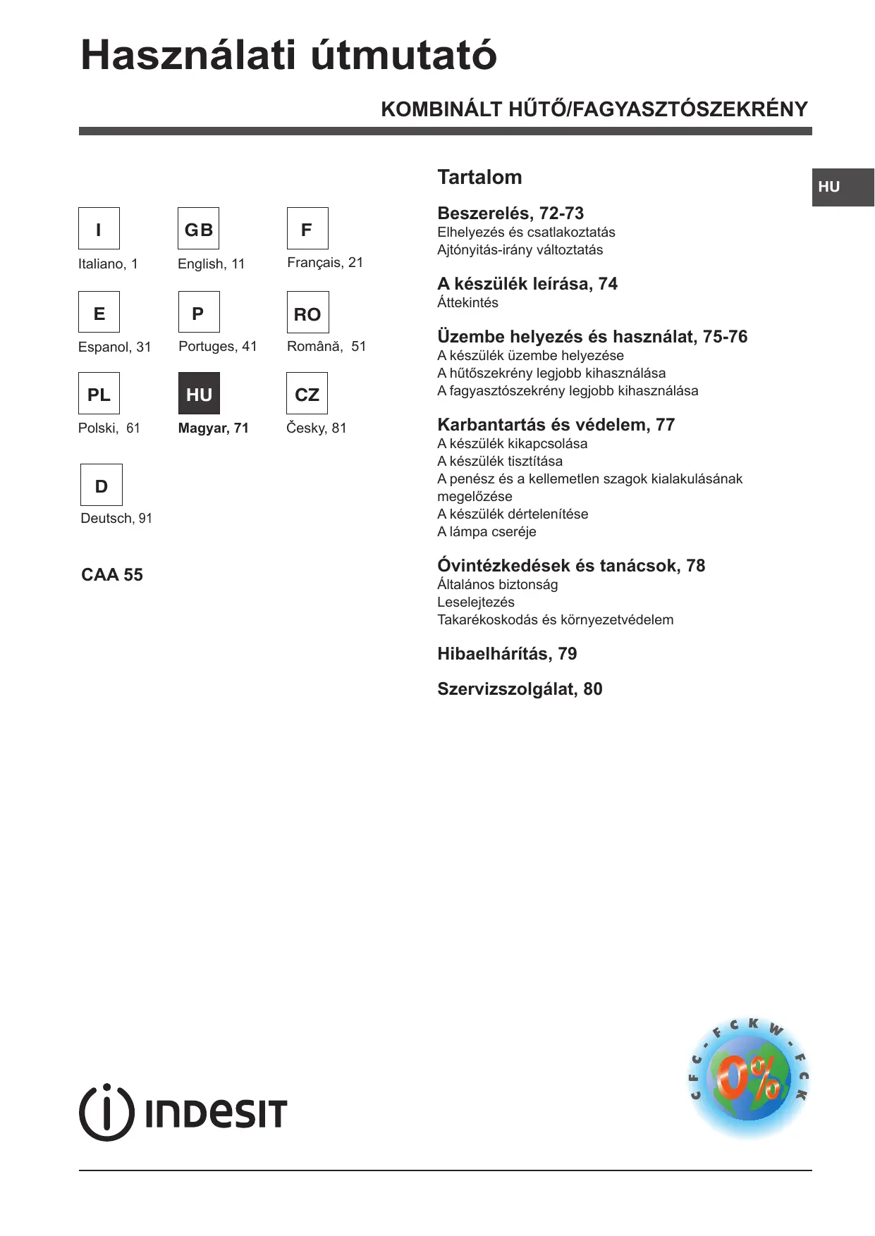 HASZNÁLATI ÚTMUTATÓ CAA 55, CAA 55 NX, CAA55, CAA55, CAA55, CAA55NX INDESIT