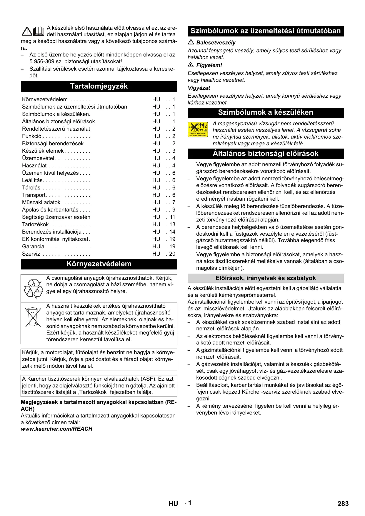 RU - 20 A készülék első használata előtt olvassa el ezt az eredeti használati utasítást, ez alapján járjon el és tartsa meg a későbbi használatra vagy a következő tulajdonos számára. – Az első üzembe helyezés előtt mindenképpen olvassa el az 5.956-309 sz. biztonsági utasításokat! – Szállítási sérülések esetén azonnal tájékoztassa a kereskedőt. Tartalomjegyzék Környezetvédelem . . . . . . . Szimbólumok az üzemeltetési útmutatóban Szimbólumok a készüléken. Általános biztonsági előírások Rendeltetésszerű használat Funkció . . . . . . . . . . . . . . . . Biztonsági berendezések . . Készülék elemek . . . . . . . . . Üzembevétel . . . . . . . . . . . . Használat . . . . . . . . . . . . . . Üzemen kívül helyezés . . . . Leállítás. . . . . . . . . . . . . . . . Tárolás . . . . . . . . . . . . . . . . Transport. . . . . . . . . . . . . . . Műszaki adatok . . . . . . . . . . Ápolás és karbantartás . . . . Segítség üzemzavar esetén Tartozékok. . . . . . . . . . . . . . Berendezés installációja . . . EK konformitási nyiltakozat . Garancia . . . . . . . . . . . . . . . Szerviz . . . . . . . . . . . . . . . .