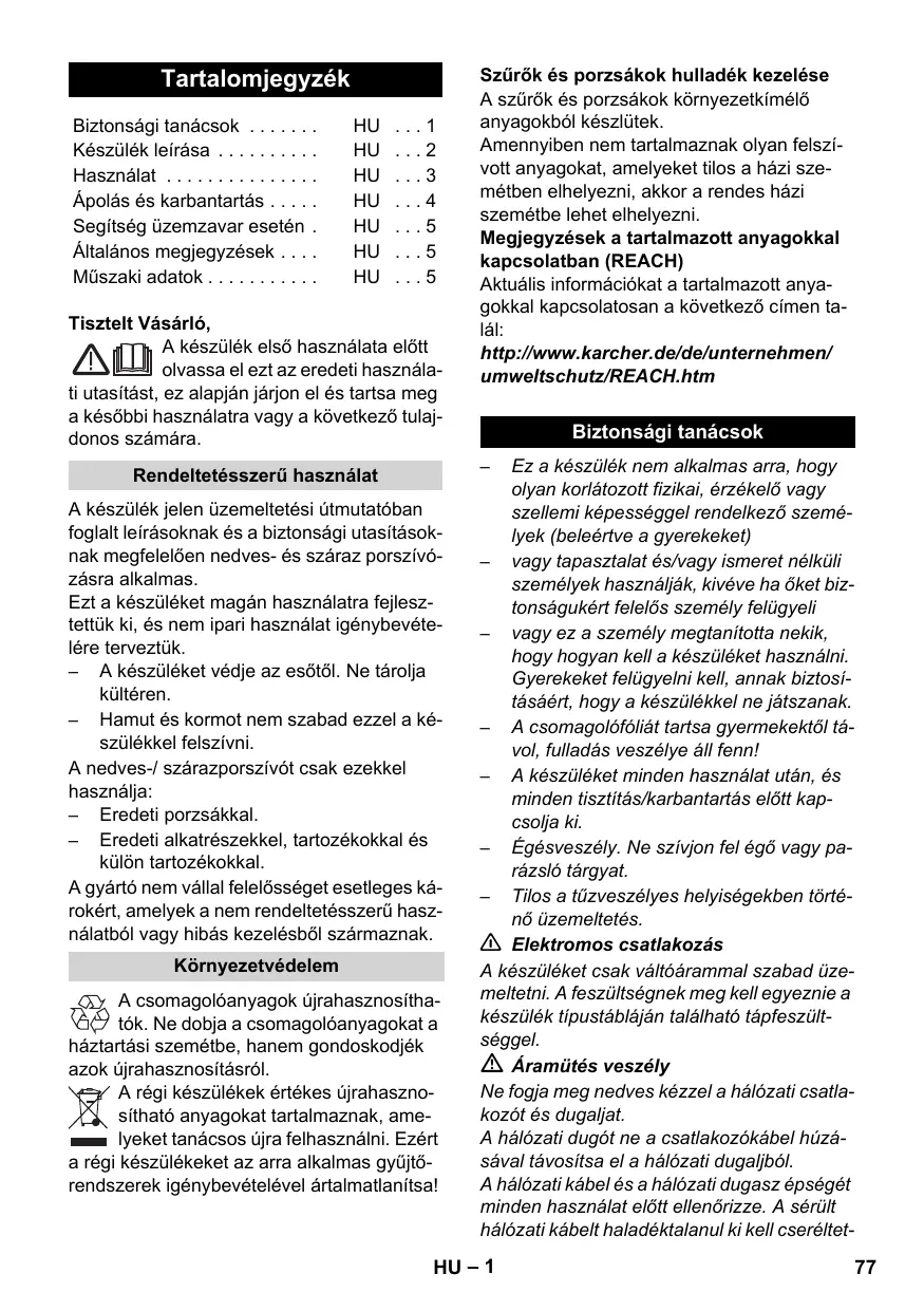 Le filtre et le sac du filtre sont fabriqués en matériaux recyclables. S'ils ne contiennent aucune substance aspirée dont l'élimination est interdite dans les déchets ménagers, vous pouvez les jeter dans les déchets ordinaires. Instructions relatives aux ingrédients (REACH) Les informations actuelles relatives aux ingrédients se trouvent sous : http://www.karcher.de/de/unternehmen/ umweltschutz/REACH.htm