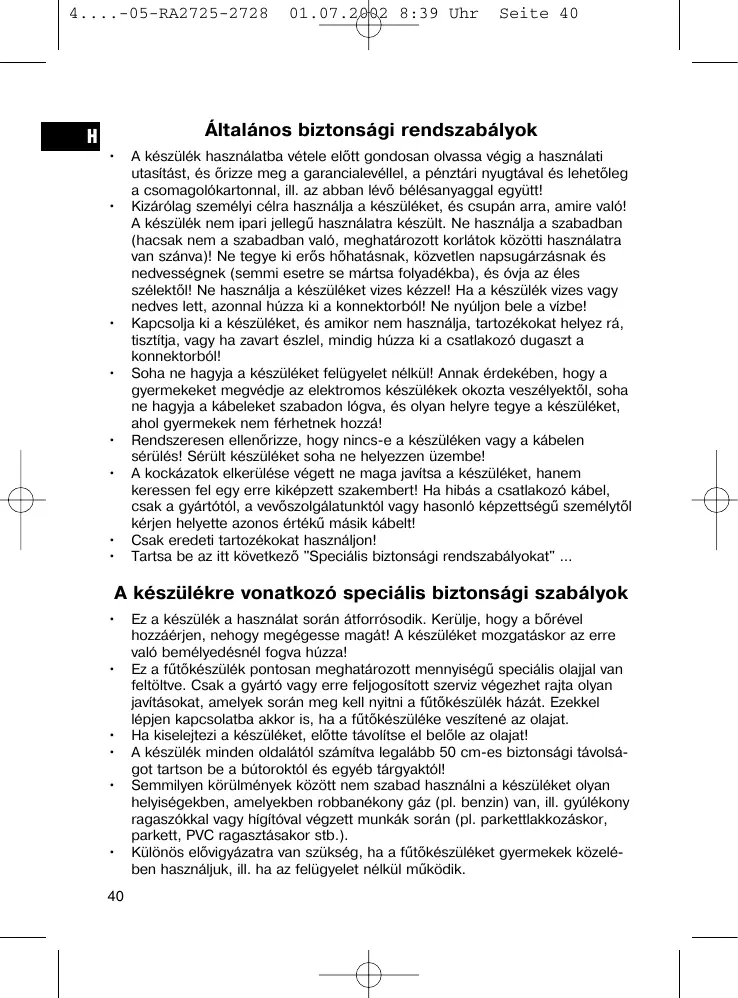 A készülék használatba vétele előtt gondosan olvassa végig a használati utasítást, és őrizze meg a garancialevéllel, a pénztári nyugtával és lehetőleg a csomagolókartonnal, ill. az abban lévő bélésanyaggal együtt! Kizárólag személyi célra használja a készüléket, és csupán arra, amire való! A készülék nem ipari jellegű használatra készült. Ne használja a szabadban (hacsak nem a szabadban való, meghatározott korlátok közötti használatra van szánva)! Ne tegye ki erős hőhatásnak, közvetlen napsugárzásnak és nedvességnek (semmi esetre se mártsa folyadékba), és óvja az éles szélektől! Ne használja a készüléket vizes kézzel! Ha a készülék vizes vagy nedves lett, azonnal húzza ki a konnektorból! Ne nyúljon bele a vízbe! Kapcsolja ki a készüléket, és amikor nem használja, tartozékokat helyez rá, tisztítja, vagy ha zavart észlel, mindig húzza ki a csatlakozó dugaszt a konnektorból! Soha ne hagyja a készüléket felügyelet nélkül! Annak érdekében, hogy a gyermekeket megvédje az elektromos készülékek okozta veszélyektől, soha ne hagyja a kábeleket szabadon lógva, és olyan helyre tegye a készüléket, ahol gyermekek nem férhetnek hozzá! Rendszeresen ellenőrizze, hogy nincs-e a készüléken vagy a kábelen sérülés! Sérült készüléket soha ne helyezzen üzembe! A kockázatok elkerülése végett ne maga javítsa a készüléket, hanem keressen fel egy erre kiképzett szakembert! Ha hibás a csatlakozó kábel, csak a gyártótól, a vevőszolgálatunktól vagy hasonló képzettségű személytől kérjen helyette azonos értékű másik kábelt! Csak eredeti tartozékokat használjon! Tartsa be az itt következő "Speciális biztonsági rendszabályokat" ...