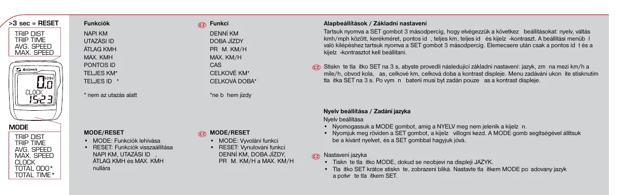 - nem az utazés alt MODE/RESET. MODE: Funkciôk lehiväsa RESET. Funkciôk visszaâlltésa NAPI KM, UTAZASI D, ATLAG KMH és MAX. KMH nulära @ Funkci DENNI KM DOBA JizY PR M. KM/H