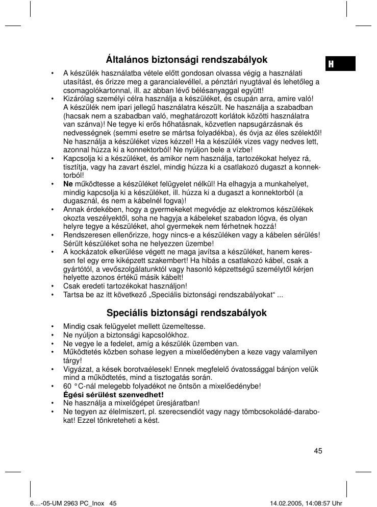 Mindig csak felügyelet mellett üzemeltesse. Ne nyúljon a biztonsági kapcsolókhoz. Ne vegye le a fedelet, amíg a készülék üzemben van. Működtetés közben sohase legyen a mixelőedényben a keze vagy valamilyen tárgy! Vigyázat, a kések borotvaélesek! Ennek megfelelő óvatossággal bánjon velük mind a működtetés, mind a tisztogatás során. 60 °C-nál melegebb folyadékot ne öntsön a mixelőedénybe! Égési sérülést szenvedhet! Ne használja a mixelőgépet üresjáratban! Ne tegyen az élelmiszert, pl. szerecsendiót vagy nagy tömbcsokoládé-darabokat! Ezzel tönkreteheti a kést.