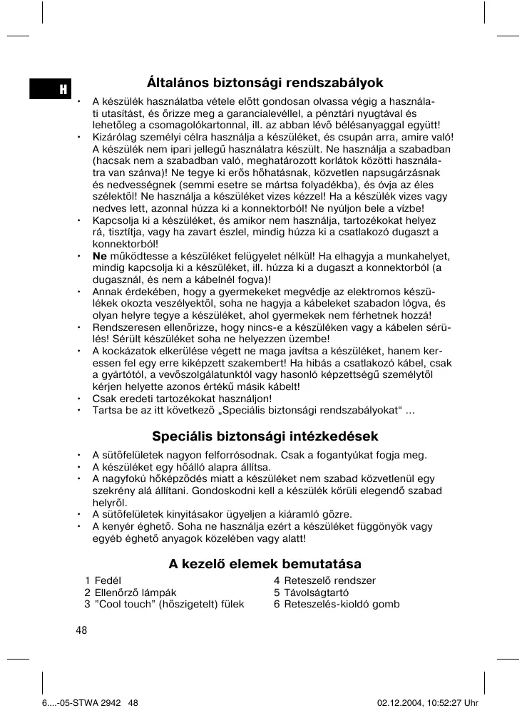 Kizárolag szemelyi celra hasznalja a keszüléket, és csupán arra, amire való! A keszülék nem ipari jellegő hasznalatra keszült. Ne hasznalja a szabadban (hacsak nem a szabadban való, meghatározott kloratók kozötti hasznalatra van szána?! Ne tegye ki erós hóhatásnak, közvetlen napsugárásnak és nedvességnek (semmi esetre se márta solyadékba), és övja az éles szélektő! Ne hasznaljá a keszüléket vizes kézzel! Ha a keszülék vizes vagy nedveslett, azonnul húzza ki a konnektörból! Ne nyúljon bele a vizbe!