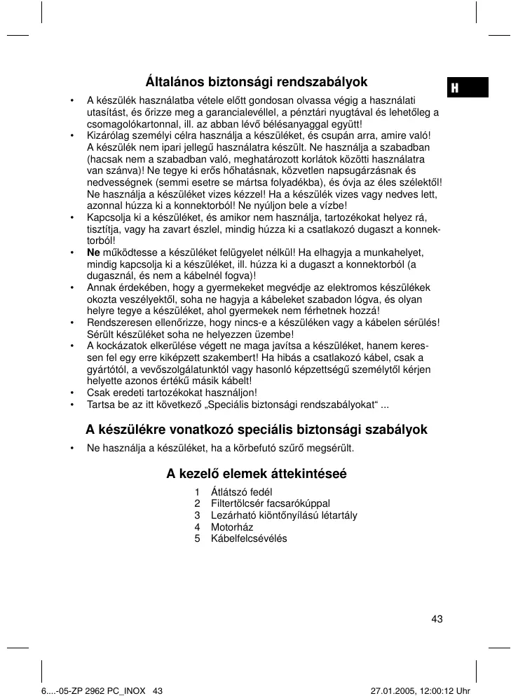 H A készülék használatba vétele előtt gondosan olvassa végig a használati utasítást, és őrizze meg a garancialevéllel, a pénztári nyugtával és lehetőleg a csomagolókartonnal, ill. az abban lévő bélésanyaggal együtt! Kizárólag személyi célra használja a készüléket, és csupán arra, amire való! A készülék nem ipari jellegű használatra készült. Ne használja a szabadban (hacsak nem a szabadban való, meghatározott korlátok közötti használatra van szánva)! Ne tegye ki erős hőhatásnak, közvetlen napsugárzásnak és nedvességnek (semmi esetre se mártsa folyadékba), és óvja az éles szélektől! Ne használja a készüléket vizes kézzel! Ha a készülék vizes vagy nedves lett, azonnal húzza ki a konnektorból! Ne nyúljon bele a vízbe! Kapcsolja ki a készüléket, és amikor nem használja, tartozékokat helyez rá, tisztítja, vagy ha zavart észlel, mindig húzza ki a csatlakozó dugaszt a konnektorból! Ne működtesse a készüléket felügyelet nélkül! Ha elhagyja a munkahelyet, mindig kapcsolja ki a készüléket, ill. húzza ki a dugaszt a konnektorból (a dugasznál, és nem a kábelnél fogva)! Annak érdekében, hogy a gyermekeket megvédje az elektromos készülékek okozta veszélyektől, soha ne hagyja a kábeleket szabadon lógva, és olyan helyre tegye a készüléket, ahol gyermekek nem férhetnek hozzá! Rendszeresen ellenőrizze, hogy nincs-e a készüléken vagy a kábelen sérülés! Sérült készüléket soha ne helyezzen üzembe! A kockázatok elkerülése végett ne maga javítsa a készüléket, hanem keressen fel egy erre kiképzett szakembert! Ha hibás a csatlakozó kábel, csak a gyártótól, a vevőszolgálatunktól vagy hasonló képzettségű személytől kérjen helyette azonos értékű másik kábelt! Csak eredeti tartozékokat használjon! Tartsa be az itt következő „Speciális biztonsági rendszabályokat“ ...