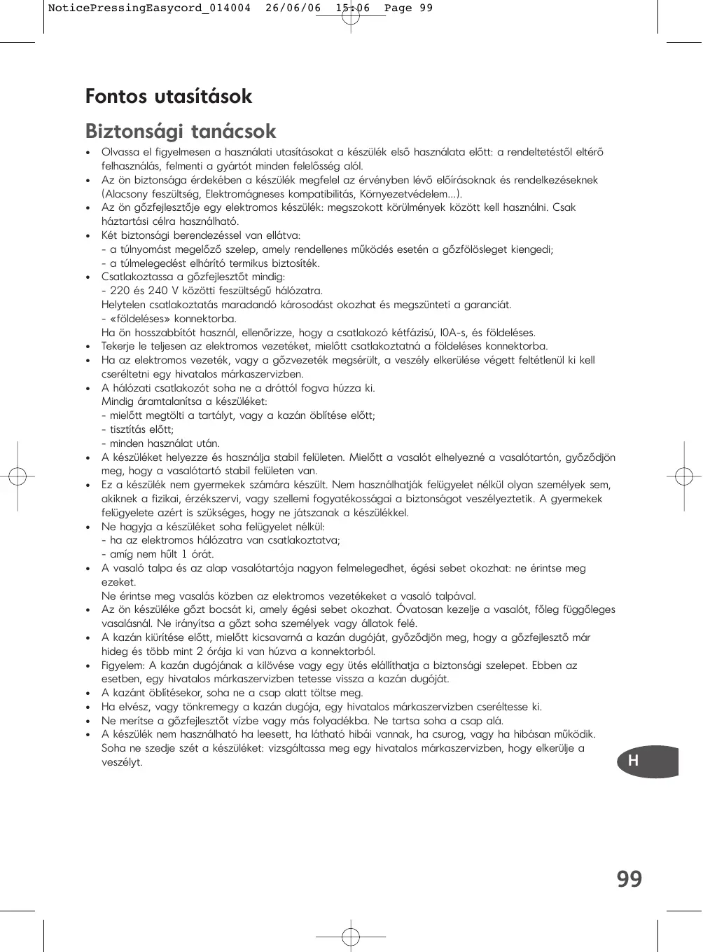 NoticePressingEasycord_ 014004 26/06/06 & Page 99 Fontos utasitäsok Biztonsägi tanäcsok Olvassa el figyelmesen a hasznélati utasitäsokat a készülék elsô hasznlata elôtt: a rendeltetéstôl eltéré felhasznälés, fementi a gyértôt minden felelésség alé Az ôn biztonsäga érdekében a készülék megfelel az érvényben lévé elëiräsoknak és rendelkezéseknek (Alacsony feszültség, Elektromägneses kompatibiltés, Kômyezetvédelem Az ôn gézellesztôje egy elektromos készülék: megszokott Kôrülmények këzôtt kell hasznäini. Csak häztartési célra hasznälhaté. Két biztonsägi berendezéssel van ellätva: - a tünyomäst megelézé szelep, amely rendellenes mükôdés esetén a gézféléseget kiengedi; - a tülmelegedést elhärité termikus biztositék. Csatlakoztassa a gôzfejlesztét mindig: - 220 és 240 V kôzôtti feszültségü hälézatra. Helytelen csatiakoztatäs maradandé kärosodést okozhat és megszünteti a garanciät. - «féldeléses» konnektorba. Ha ôn hosszabbitét hasznäl, ellenôrizze, hogy a csatlakozé kétfézisé, IOA-s, és fôldeléses. Tekerje le telesen az elektromos vezetéket, mielôtt csatiakoztatné a féldeléses konnektorbar Ha az elektromos vezeték, vagy a gôzvezeték megsérült, a veszély elkerülése végett feltétlenül ki kell cseréletni egy hivatalos mérkaszervizben A hälézati csatiakozôt soha ne a drôttôl fogva hôzza ki Mindig éramtalanitsa a készüléket: - mielôtt megtôlti a tartlyt, vagy a kazän ëblitése elôtt; - tisztités elôtt; - minden hasznélat utén. A készüléket helyezze és hasznélja stabil felületen. Mielôtt a vasalôt elhelyezné a vasalôtartôn, gy6zédjôn meg, hogy a vasalétarté stabil felületen van. Ez a készülék nem gyermekek szämra készült. Nem hasznälhatjék felügyelet nélkül olyan személyek sem, akiknek a fizikai, érzékszervi, vagy szellemi fogyatékossägai a biztonsägot veszélyeztetik. À gyermekek felügyelete azért is szükséges, hogy ne jétszanak a készülékkel Ne hagyja a készüléket soha felügyelet nékül - ha az elektromos hélézatra van csatiakoztatva; - amig nem hült 1 érât. A vasalé talpa és az alap vasalétartéja nagyon felmelegedhet, égési sebet okozhat: ne érintse meg ‘ezeket. Ne érintse meg vasalés kôzben az elektromos vezetékeket a vasalé talpäval. Az ôn készüléke gôzt bocsät ki, amely égési sebet okozhat. Ovatosan kezele a vasalét, féleg függéleges vasalésnäl. Ne iränyitsa a gézt soha személyek vagy éllatok felé. A kazôn kiüritése elôtt, mielôtt kicsavamä a kazén dugéjét, gy6zôdiën meg, hogy a gôzfejleszté mér hideg és tôbb mint 2 éréja ki van hézva a konnektorbôl Figyelem: À kazän dugéjénak a kilëvése vagy egy ütés elélithatja a biztonsägi szelepet. Ebben az esetben, egy hivatalos mérkaszervizben tetesse vissza a kazän dugôjét. A kazänt ôblitésekor, soha ne a csap alatt tôltse meg. Ha elvész, vagy tônkremegy a kazén dugéja, egy hivatalos mrkaszervizben cseréltesse ki Ne meritse a gôzfejlesztôt vizbe vagy môs folyadékba. Ne tartsa soha a csap alé. A készülék nem hasznälhaté ha leesett, ha léthaté hibéi vannak, ha csurog, vagy ha hibésan mükdik. Soha ne szedje szét a készüléket: vizsgältassa meg egy hivatalos mérkaszervizben, hogy elkerüje a veszélyt