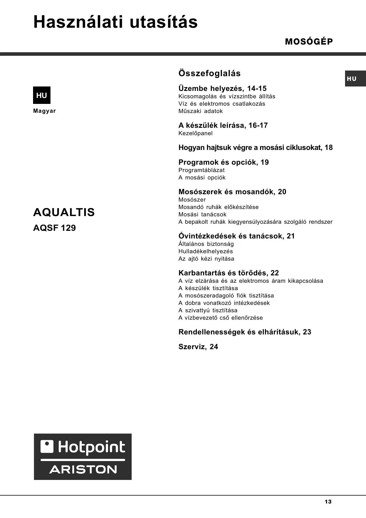 Téléchargez la notice de votre Mosógép au format PDF gratuitement ! Retrouvez votre notice AQSF 129 - HOTPOINT et reprennez votre appareil électronique en main. Sur cette page sont publiés tous les documents nécessaires à l'utilisation de votre appareil AQSF 129 de la marque HOTPOINT.