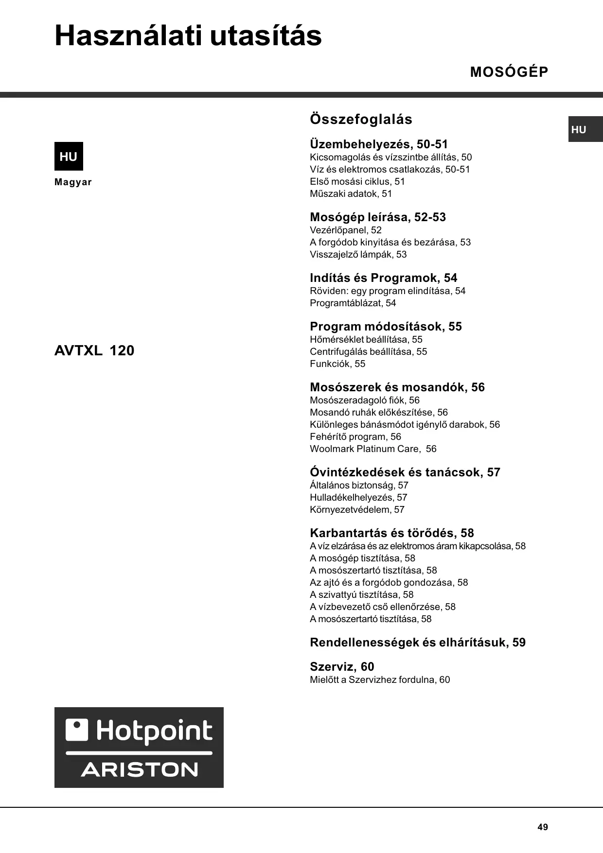 HASZNÁLATI ÚTMUTATÓ AVTXL 120 HOTPOINT