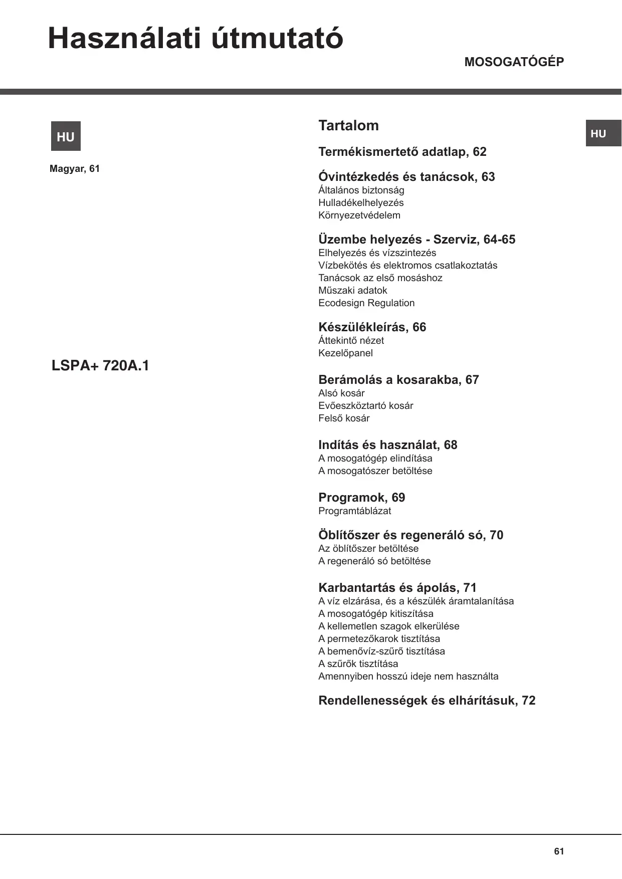 LSPA 720A.1 X/HA - Mosogatógépek HOTPOINT - Ingyenes használati útmutató