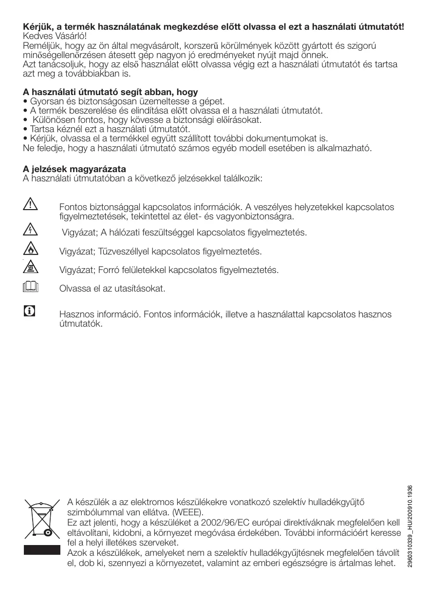 Attention; Avertissement de tension d'alimentation électrique. Attention; Avertissement de risque d’incendie. Attention; Avertissement concernant les surfaces chaudes. Lisez les instructions. Informations utiles. Informations importantes ou conseils pratiques relatives à l’utilisation.