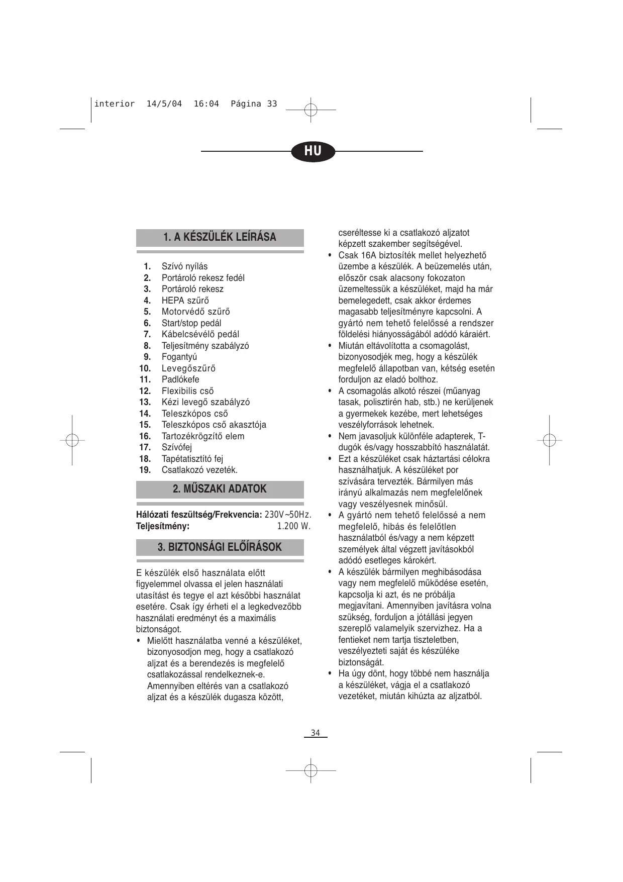 cseréltesse ki a csatlakozó aljzatot képzett szakember segítségével. Csak 16A biztosíték mellet helyezhető üzembe a készülék. A beüzemelés után, először csak alacsony fokozaton üzemeltessük a készüléket, majd ha már bemelegedett, csak akkor érdemes magasabb teljesítményre kapcsolni. A gyártó nem tehető felelőssé a rendszer földelési hiányosságából adódó káraiért. Miután eltávolította a csomagolást, bizonyosodjék meg, hogy a készülék megfelelő állapotban van, kétség esetén forduljon az eladó bolthoz. A csomagolás alkotó részei (műanyag tasak, polisztirén hab, stb.) ne kerüljenek a gyermekek kezébe, mert lehetséges veszélyforrások lehetnek. Nem javasoljuk különféle adapterek, Tdugók és/vagy hosszabbító használatát. Ezt a készüléket csak háztartási célokra használhatjuk. A készüléket por szívására tervezték. Bármilyen más irányú alkalmazás nem megfelelőnek vagy veszélyesnek minősül. A gyártó nem tehető felelőssé a nem megfelelő, hibás és felelőtlen használatból és/vagy a nem képzett személyek által végzett javításokból adódó esetleges károkért. A készülék bármilyen meghibásodása vagy nem megfelelő működése esetén, kapcsolja ki azt, és ne próbálja megjavítani. Amennyiben javításra volna szükség, forduljon a jótállási jegyen szereplő valamelyik szervizhez. Ha a fentieket nem tartja tiszteletben, veszélyezteti saját és készüléke biztonságát. Ha úgy dönt, hogy többé nem használja a készüléket, vágja el a csatlakozó vezetéket, miután kihúzta az aljzatból. interior 14/5/04 16:04 Página 34