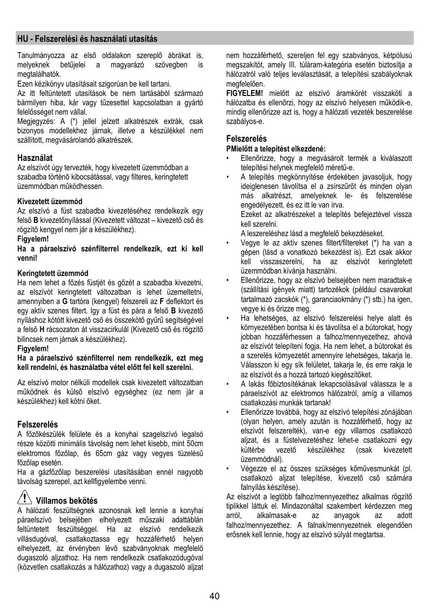 - Végezze el az összes szükséges kőművesmunkát (pl. csatlakozó aljzat telepítése, kivezető cső számára falnyílás készítése). Az elszívót a legtöbb falhoz/mennyezethez alkalmas rögzítő tiplikkel láttuk el. Mindazonáltal szakembert kérdezzen meg arról, alkalmasak-e anyagok adott falhoz/mennyezethez. A falnak/mennyezetnek elegendően erősnek kell lennie, hogy az elszívó súlyát megtartsa. Használat Az elszívót úgy tervezték, hogy kivezetett üzemmódban a szabadba történõ kibocsátással, vagy filteres, keringtetett üzemmódban mûködhessen. Kivezetett üzemmód Az elszívó a füst szabadba kivezetéséhez rendelkezik egy felső B kivezetőnyílással (Kivezetett változat – kivezető cső és rögzítő kengyel nem jár a készülékhez). Figyelem! Ha a páraelszívó szénfilterrel rendelkezik, ezt ki kell venni! Keringtetett üzemmód Ha nem lehet a főzés füstjét és gőzét a szabadba kivezetni, az elszívót keringtetett változatban is lehet üzemeltetni, amennyiben a G tartóra (kengyel) felszereli az F deflektort és egy aktív szenes filtert. Igy a füst és pára a felső B kivezető nyíláshoz kötött kivezető cső és összekötő gyűrű segítségével a felső H rácsozaton át visszacirkulál (Kivezető cső és rögzítő bilincsek nem járnak a készülékhez). Figyelem! Ha a páraelszívó szénfilterrel nem rendelkezik, ezt meg kell rendelni, és használatba vétel előtt fel kell szerelni. Az elszívó motor nélküli modellek csak kivezetett változatban működnek és külső elszívó egységhez (ez nem jár a készülékhez) kell kötni őket. Felszerelés A főzőkészülék felülete és a konyhai szagelszívó legalsó része közötti minimális távolság nem lehet kisebb, mint 50cm elektromos főzőlap, és 65cm gáz vagy vegyes tüzelésű főzőlap esetén. Ha a gázfőzőlap beszerelési utasításában ennél nagyobb távolság szerepel, azt kellfigyelembe venni. Villamos bekötés A hálózati feszültségnek azonosnak kell lennie a konyhai páraelszívó belsejében elhelyezett műszaki adattáblán feltüntetett feszültséggel. Ha az elszívó rendelkezik villásdugóval, csatlakoztassa egy hozzáférhető helyen elhelyezett, az érvényben lévő szabványoknak megfelelő dugaszoló aljzathoz. Ha nem rendelkezik csatlakozódugóval (közvetlen csatlakozás a hálózathoz) vagy a dugaszoló aljzat