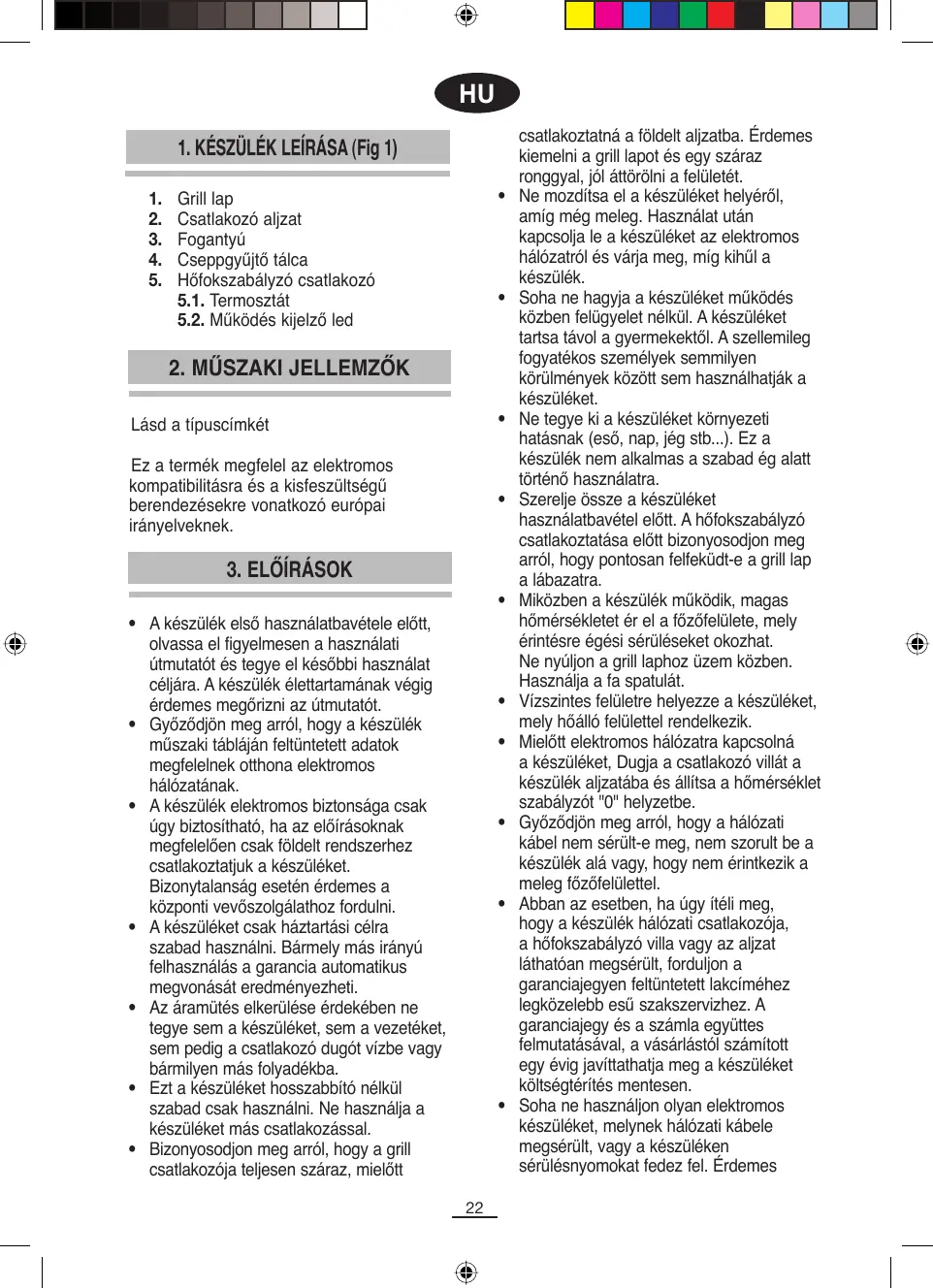 csatlakoztatná a földelt aljzatba. Érdemes kiemelni a grill lapot és egy száraz ronggyal, jól áttörölni a felületét. Ne mozdítsa el a készüléket helyéről, amíg még meleg. Használat után kapcsolja le a készüléket az elektromos hálózatról és várja meg, míg kihűl a készülék. Soha ne hagyja a készüléket működés közben felügyelet nélkül. A készüléket tartsa távol a gyermekektől. A szellemileg fogyatékos személyek semmilyen körülmények között sem használhatják a készüléket. Ne tegye ki a készüléket környezeti hatásnak (eső, nap, jég stb...). Ez a készülék nem alkalmas a szabad ég alatt történő használatra. Szerelje össze a készüléket használatbavétel előtt. A hőfokszabályzó csatlakoztatása előtt bizonyosodjon meg arról, hogy pontosan felfeküdt-e a grill lap a lábazatra. Miközben a készülék működik, magas hőmérsékletet ér el a főzőfelülete, mely érintésre égési sérüléseket okozhat. Ne nyúljon a grill laphoz üzem közben. Használja a fa spatulát. Vízszintes felületre helyezze a készüléket, mely hőálló felülettel rendelkezik. Mielőtt elektromos hálózatra kapcsolná a készüléket, Dugja a csatlakozó villát a készülék aljzatába és állítsa a hőmérséklet szabályzót "0" helyzetbe. Győződjön meg arról, hogy a hálózati kábel nem sérült-e meg, nem szorult be a készülék alá vagy, hogy nem érintkezik a meleg főzőfelülettel. Abban az esetben, ha úgy ítéli meg, hogy a készülék hálózati csatlakozója, a hőfokszabályzó villa vagy az aljzat láthatóan megsérült, forduljon a garanciajegyen feltüntetett lakcíméhez legközelebb esű szakszervizhez. A garanciajegy és a számla együttes felmutatásával, a vásárlástól számított egy évig javíttathatja meg a készüléket költségtérítés mentesen. Soha ne használjon olyan elektromos készüléket, melynek hálózati kábele megsérült, vagy a készüléken sérülésnyomokat fedez fel. Érdemes