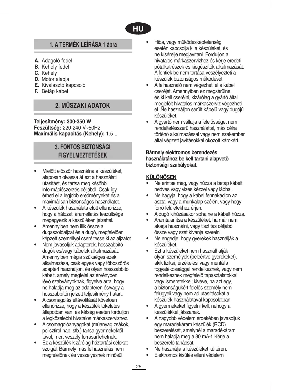 érdekében ne merítse se a készüléket, se a dugót vízbe, vagy bármely más folyadékba. A készülék működése közben ne érintse meg annak mozgó részeit. Ne használja, és ne tegye a készülék semmilyen részét forró felület közelébe (gáz vagy elektromos főzőlapok vagy sütők). Működés közben a készüléket ne hagyja felügyelet nélkül. Ne vegye le a kelyhet a motorról, amikor a készülék működik. A készülék rendelkezik egy kétszeres biztonsági megszakítóval, amely leállítja a mechanizmust, ha a kehely nincs a motoralapon (vagy nem a helyén van), vagy ha a fedél nincs a helyén. többszer egymás után összes és szétszereli.