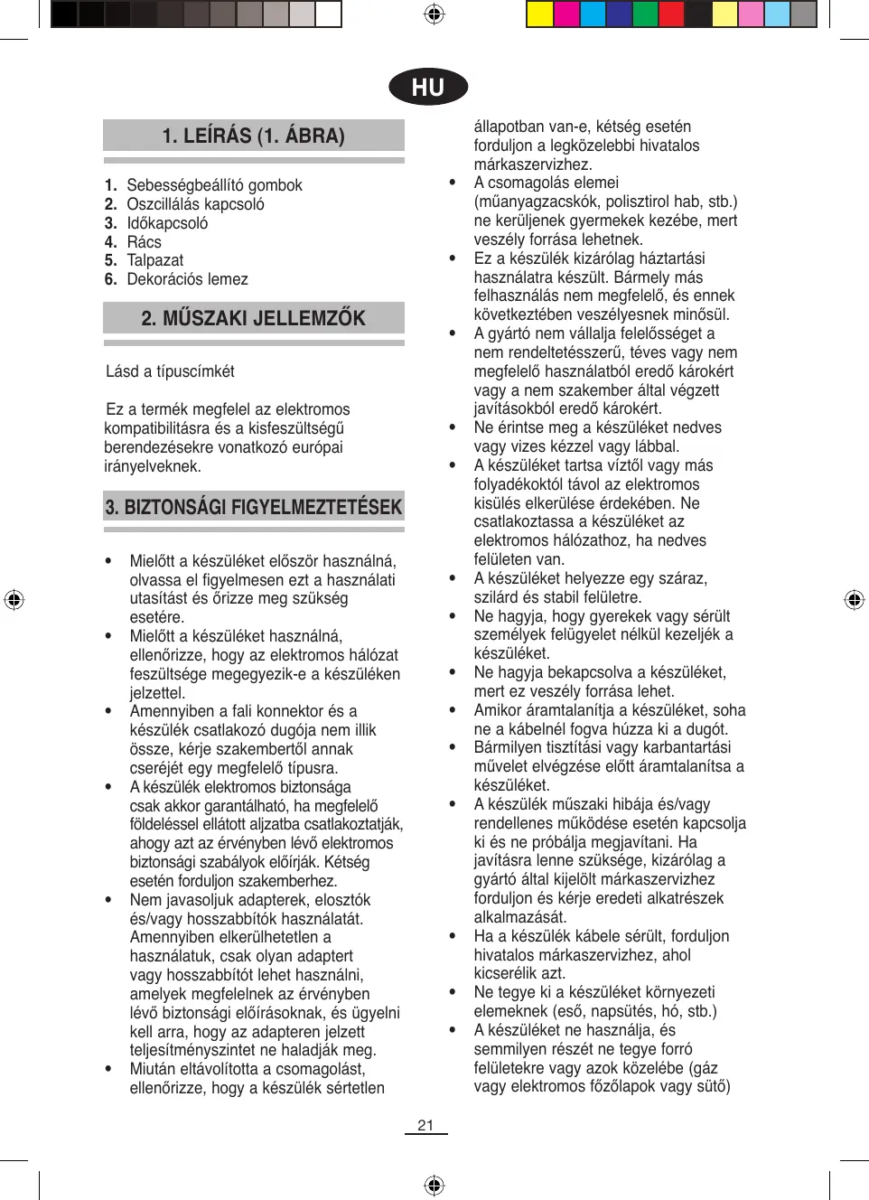állapotban van-e, kétség esetén forduljon a legközelebbi hivatalos márkaszervizhez. A csomagolás elemei (műanyagzacskók, polisztirol hab, stb.) ne kerüljenek gyermekek kezébe, mert veszély forrása lehetnek. Ez a készülék kizárólag háztartási használatra készült. Bármely más felhasználás nem megfelelő, és ennek következtében veszélyesnek minősül. A gyártó nem vállalja felelősséget a nem rendeltetésszerű, téves vagy nem megfelelő használatból eredő károkért vagy a nem szakember által végzett javításokból eredő károkért. Ne érintse meg a készüléket nedves vagy vizes kézzel vagy lábbal. A készüléket tartsa víztől vagy más folyadékoktól távol az elektromos kisülés elkerülése érdekében. Ne csatlakoztassa a készüléket az elektromos hálózathoz, ha nedves felületen van. A készüléket helyezze egy száraz, szilárd és stabil felületre. Ne hagyja, hogy gyerekek vagy sérült személyek felügyelet nélkül kezeljék a készüléket. Ne hagyja bekapcsolva a készüléket, mert ez veszély forrása lehet. Amikor áramtalanítja a készüléket, soha ne a kábelnél fogva húzza ki a dugót. Bármilyen tisztítási vagy karbantartási művelet elvégzése előtt áramtalanítsa a készüléket. A készülék műszaki hibája és/vagy rendellenes működése esetén kapcsolja ki és ne próbálja megjavítani. Ha javításra lenne szüksége, kizárólag a gyártó által kijelölt márkaszervizhez forduljon és kérje eredeti alkatrészek alkalmazását. Ha a készülék kábele sérült, forduljon hivatalos márkaszervizhez, ahol kicserélik azt. Ne tegye ki a készüléket környezeti elemeknek (eső, napsütés, hó, stb.) A készüléket ne használja, és semmilyen részét ne tegye forró felületekre vagy azok közelébe (gáz vagy elektromos főzőlapok vagy sütő)