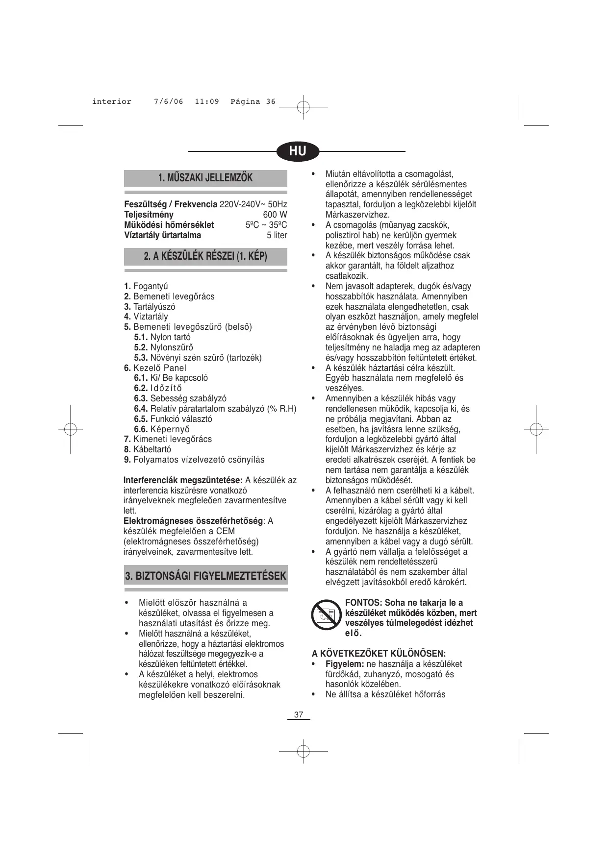 5.1. Soporte de Nylon 5.2. Filtro de Nylon 5.3. Filtro de carbón vegetal (incluido) Panel de mandos 6.1. Interruptor 6.2. Temporizador 6.3. Selector velocidad Desaconsejamos el uso de adaptadores, clavijas y/o cables de extensión. Si dichos elementos fueran indispensables, use sólo los que respeten las normas de seguridad vigentes, cuidando en no sobrepasar el límite de potencia indicado en el adaptador y/o en el cable de extensión. Este aparato debe utilizarse solo para uso doméstico. Cualquier otro uso se considera inadecuado y peligroso. En caso de avería y/o mal funcionamiento del aparato, apagarlo y no tratar de arreglarlo. En caso de necesitar reparación, dirigirse únicamente a un Servicio de Asistencia Técnico autorizado por el fabricante y solicitar el uso de recambios originales. De no respetar lo anteriormente indicado se pondrá en peligro la seguridad del aparato. El usuario no debe proceder a la sustitución del cable. En caso de que esté estropeado o haya que sustituirlo, dirigirse exclusivamente a un Servicio de Asistencia Técnico autorizado por el fabricante. No utilice el aparato con el cable o la clavija dañados. El fabricante no será responsable de daños que puedan derivar del uso inapropiado equivocado o poco adecuado o bien de reparaciones efectuadas por personal no cualificado.