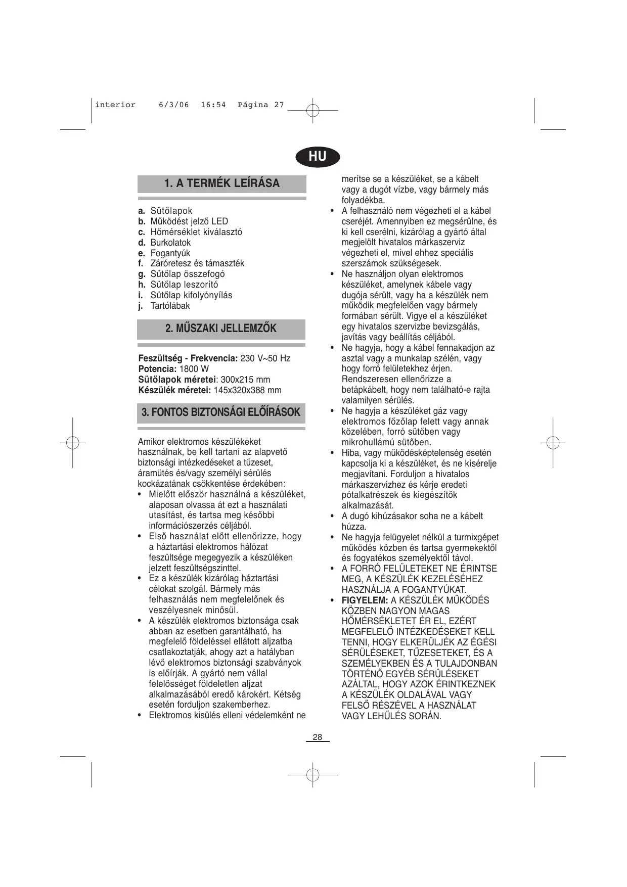 Feszültség - Frekvencia: 230 V~50 Hz Potencia: 1800 W Sütőlapok méretei: 300x215 mm Készülék méretei: 145x320x388 mm