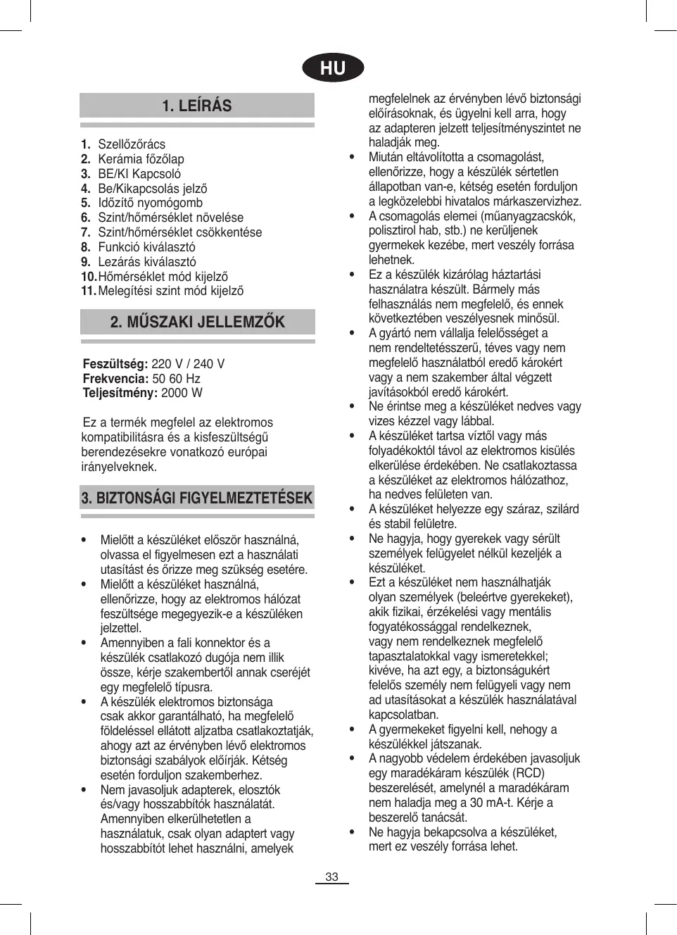 Amikor áramtalanítja a készüléket, soha ne a kábelnél fogva húzza ki a dugót. Bármilyen tisztítási vagy karbantartási művelet elvégzése előtt áramtalanítsa a készüléket. A készülék műszaki hibája és/vagy rendellenes működése esetén kapcsolja ki és ne próbálja megjavítani. Ha javításra lenne szüksége, kizárólag a gyártó által kijelölt márkaszervizhez forduljon és kérje eredeti alkatrészek alkalmazását. Ha a készülék kábele sérült, forduljon hivatalos márkaszervizhez, ahol kicserélik azt. Ne tegye ki a készüléket környezeti elemeknek (eső, napsütés, hó, stb.) A készüléket ne használja, és semmilyen részét ne tegye forró felületekre vagy azok közelébe (gáz vagy elektromos főzőlapok vagy sütő) Ne használjon dörzshatású tisztítószereket vagy törlőruhát a készülék tisztításához. Ne érintse meg a forró felületeket. Használja a füleket vagy fogantyúkat. Ügyeljen arra, hogy a kábel ne érintkezzen a készülék forró részeivel. Ne szerelje szét, és ne kísérelje megjavítani a készüléket. A készülék tetejére ne helyezzen semmilyen nehéz tárgyat. Ne használja a főzőlapot gyúlékony gázforrás közelében vagy nedves környezetben. Ne helyezze a főzőlapot olyan helyre, ahol víz vagy olaj ráfröccsenhet. Működés közben figyeljen oda a főzőlapra. Vákuumcsomagolt élelmiszerek esetén nyissa fel az edény tetejét, mielőtt a főzőlapon megmelegítené. Ne használjon nem megfelelő edényeket. A szellőzőnyílásokat vagy a levegő bemeneti nyílásokat ne fedje le, és ne tegyen bele idegen tárgyakat. Az edényeket a melegítő zóna közepére helyezze. A főzőlap működését követően hagyja kihűlni, mielőtt megérintené. Ha bármely külső hibát észlel, áramtalanítsa a készüléket a rövidzárlat elkerülése érdekében.