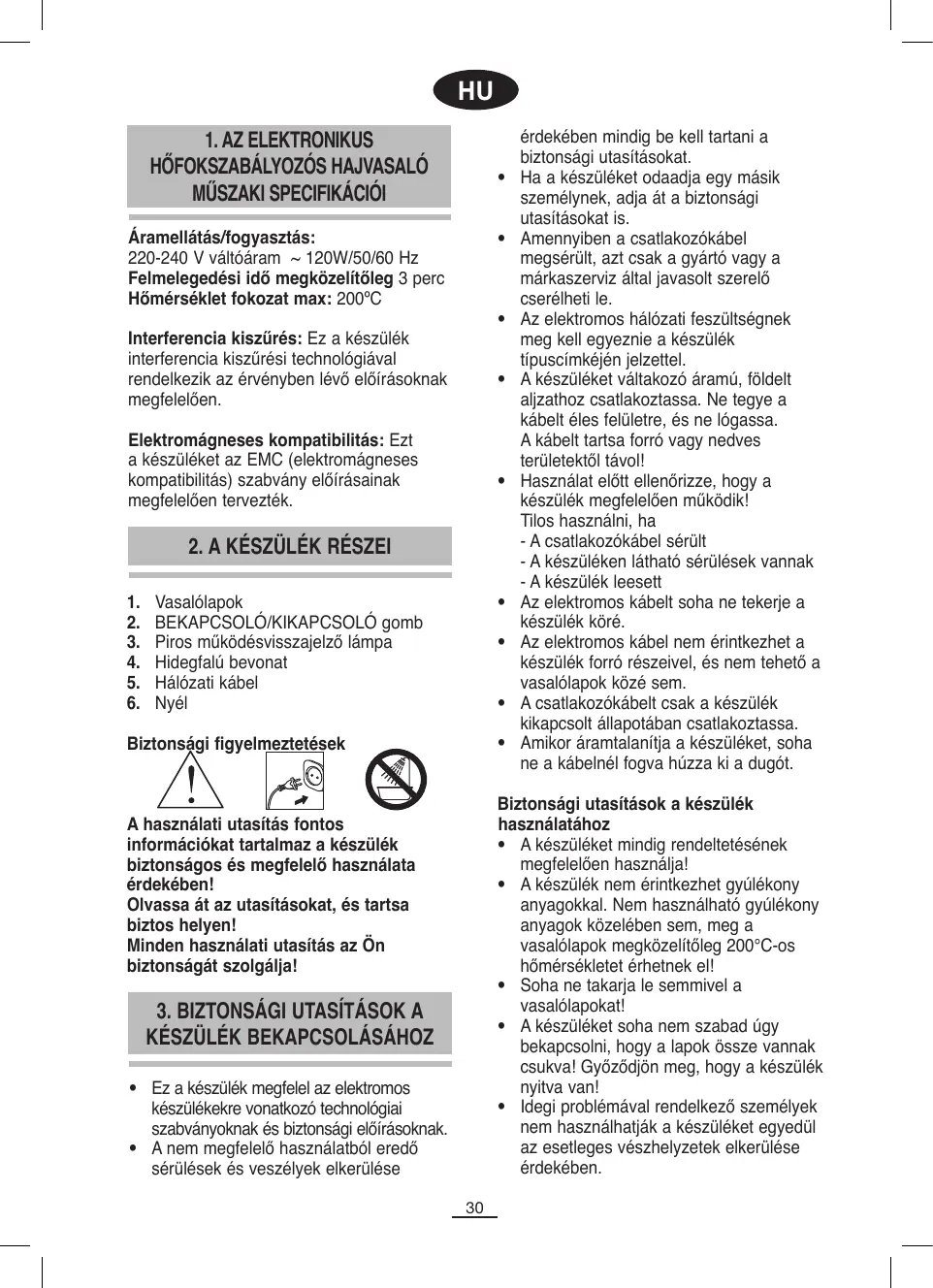 - A készülék nem érintkezhet gyúlékony anyagokkal. Nem használható gyúlékony anyagok közelében sem, meg a vasalólapok megközelítőleg 200°C-os hőmérsékletet érhetnek el!