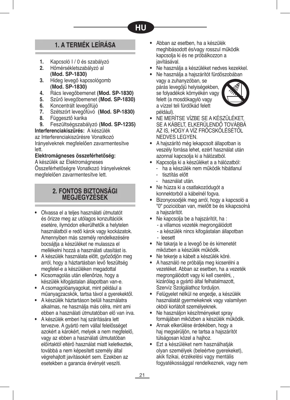 - Ne használjá a hajszárító furdǒszobában vagy a zuhanyóban, se páras levegőjú helyiségekben, se folyadékok környéken vagy felett (a mosdókagyló vagy a vizzel teli furdǒkáde felett például).