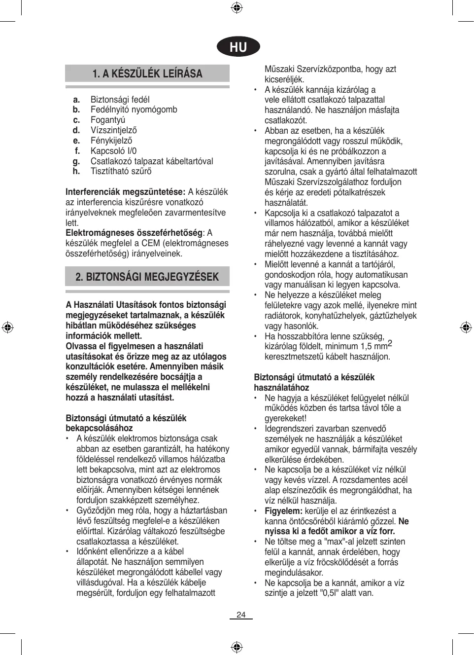 Műszaki Szervízközpontba, hogy azt kicseréljék. A készülék kannája kizárólag a vele ellátott csatlakozó talpazattal használandó. Ne használjon másfajta csatlakozót. Abban az esetben, ha a készülék megrongálódott vagy rosszul működik, kapcsolja ki és ne próbálkozzon a javításával. Amennyiben javításra szorulna, csak a gyártó által felhatalmazott Műszaki Szervízszolgálathoz forduljon és kérje az eredeti pótalkatrészek használatát. Kapcsolja ki a csatlakozó talpazatot a villamos hálózatból, amikor a készüléket már nem használja, továbbá mielőtt ráhelyezné vagy levenné a kannát vagy mielőtt hozzákezdene a tisztításához. Mielőtt levenné a kannát a tartójáról, gondoskodjon róla, hogy automatikusan vagy manuálisan ki legyen kapcsolva. Ne helyezze a készüléket meleg felületekre vagy azok mellé, ilyenekre mint radiátorok, konyhatűzhelyek, gáztűzhelyek vagy hasonlók. Ha hosszabbítóra lenne szükség, kizárólag földelt, minimum 1,5 mm2 keresztmetszetű kábelt használjon. Biztonsági útmutató a készülék használatához