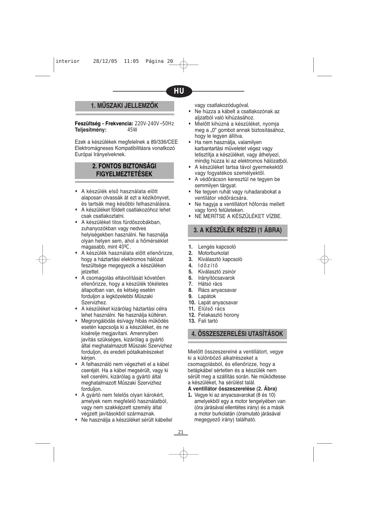 becsavaräsäval. A ventilätor felszerelése a falra (3 és 4 Âbra) *_ A ventillätort olyan helyre kell felszerelni, ahol a dugaszoléaljzat hozzäférheté a felhasznälé szämära. *_A fali tarté, mint sablon segitségével jelülje meg a lyukakat, és fürja ki egy fürészärral. Majd tegye be a tipliket és rôgzitse erésen a tartôt a csavarokkal. Akassza fel a ventillätort a tartôra. A ventillätort nem szabad 2,3 m feletti magassägra felszerelni. *_ Tegye a kivälaszté kapcsolôt (3) "O" helyzetbe hogy a ventilétor ki legyen kapcsolva, és csatlakoztassa a hélézathoz. *_ Välassza ki az 1 vagy 2, vagy 3-as éllést a kivélasztôn (3) a kivänt sebesség kapcsolôt (3) bârmelyik ,0" helyzetbe. Sebesség: 0 Kikapcsoläs 1 Alacsony 2 Küzepes 3 Magas MEGJEGYZÉS: a kivélaszté kapcsolôt (3) a kivälaszté zsinôr (5) meghüzäsäval szabälyozhatja (5. Abra) interior 28/12/05 11:05 Pégina 21 d A lengékapcsolé (1) a motor felett helyezkedik el, a hâtsé részén. Ahhoz, hogy a ventilätor lengjen, nyomja meg a lengékapcsolôt. À lengés kikapcsoläsähoz, hüzza hâtra a kapcsolôt. (6. äbra) A ventillätort kézzel felfelé vagy lefelé iränyithatja. (7. Abra) Ha azt akarja, hogy a ventillätort egy meghatärozott ideig mükôdjôn, forgassa el az idézitôt (4) az éramutaté jârasänak megfeleléen, beällitva a kivänt idôre. Az idézité segitségével kivélaszthaté maximélis idô 3 6ra ("180"). Folyamatos mükôdéshez forgassa el az idézitét (4) "CONT" helyzetb Az elektromos hälézatbél valé kikapcsoléshoz forgassa el az idôzitôt (4) "O" helyzetbe. Tisztités elôtt tegye a kivälaszté kapcsolôt (3) 0" élläsba és hüzza ki a készüléket a hélézatb6l. Ha a tisztitéshoz le akarja venni a ventillätort, kôvesse forditott sorrendben a szerelési utasitäsokat. A VENTILLÂTORT NE MERÎTSE VIZBE. Tegyen pâr csepp kenéanyagot a motor tengelyére a korrézié elkerülése érdekében. A lapätokat le lehet mosni enyhén semleges tisztitészeres langyos vizzel. Le lehet tisztitani egy puha, enyhén nedves ruhäval. Enyhén nedves ruhäval tôrôlje le a motor külsô részét. Ne hasznäljon oldészereket, sem dôrzshatäsü termékeket a ventiltor tisztitsähoz.