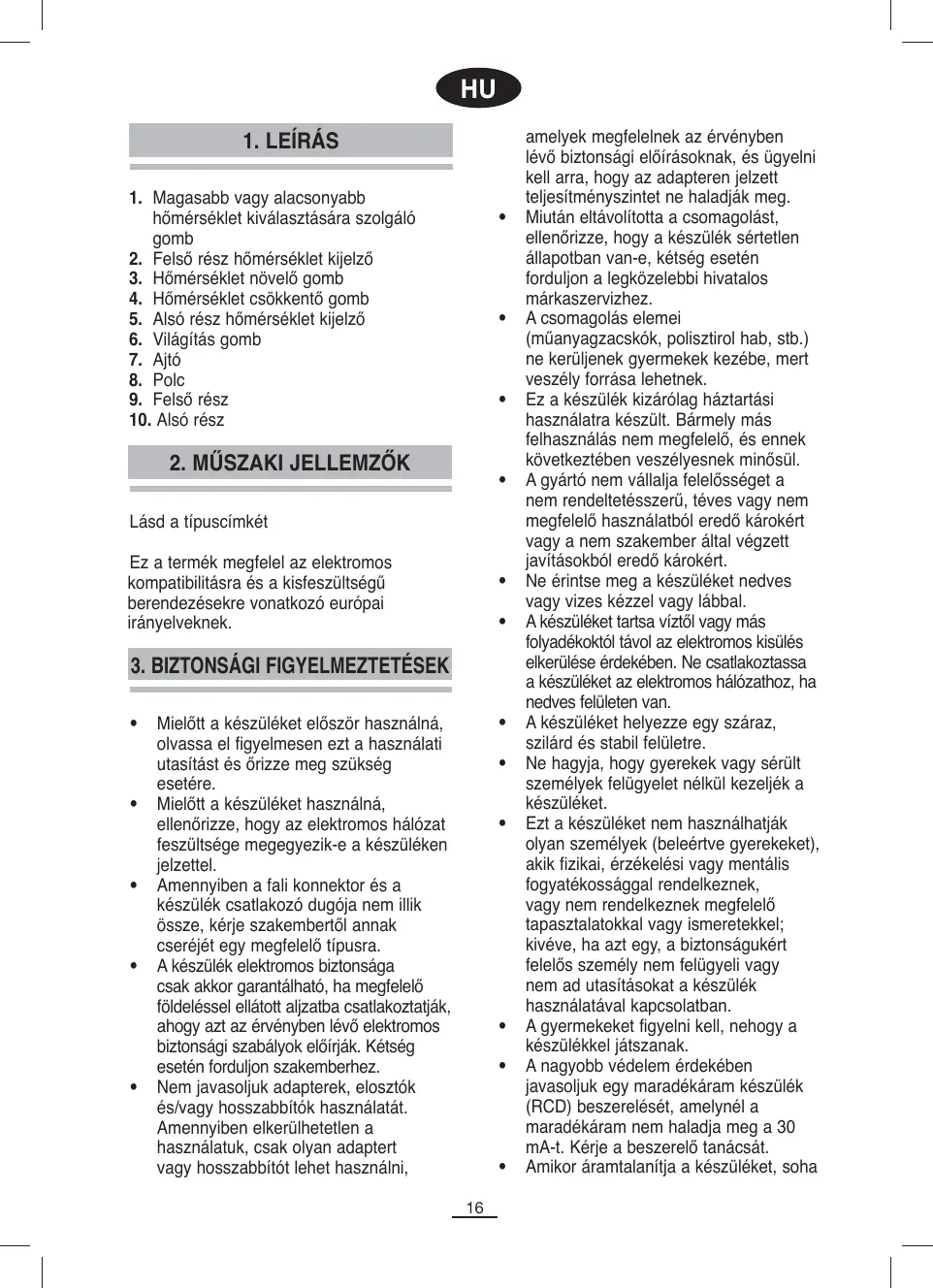 HU 1. LEÍRÁS 1. Magasabb vagy alacsonyabb hőmérséklet kiválasztására szolgáló gomb 2. Felső rész hőmérséklet kijelző 3. Hőmérséklet növelő gomb 4. Hőmérséklet csökkentő gomb 5. Alsó rész hőmérséklet kijelző 6. Világítás gomb 7. Ajtó 8. Polc 9. Felső rész 10. Alsó rész