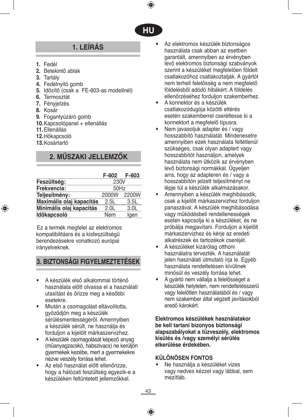 2. MŰSZAKI JELLEMZŐK F-602 F-603 Feszültség: 230V Frekvencia: 50Hz Teljesítmény: 2000W 2200W Maximális olaj kapacitás 2.5L 3.5L Minimális olaj kapacitás 2.0L 3.0L Időkapcsoló Nem Igen