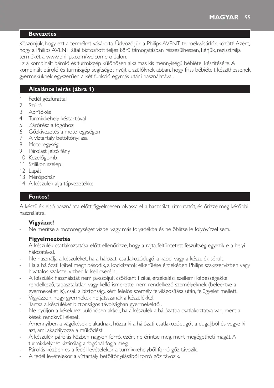 Napon/snaga: pogledajte pločicu na donjem dijelu aparata. Maksimalni kapacitet spremnika: 200 ml. Maksimalni kapacitet vrča, kruti sastojci: 800 ml. Maksimalni kapacitet vrča, tekućine: 450 ml. Radna temperatura: 10°C do 40°C Zaštita: sustav zagrijavanja s kontrolom temperature i sigurnosna brava. Magyar 55 Bevezetés Köszönjük, hogy ezt a terméket vásárolta. Üdvözöljük a Philips AVENT termékvásárlók között! Azért, hogy a Philips AVENT által biztosított teljes körű támogatásban részesülhessen, kérjük, regisztrálja termékét a www.philips.com/welcome oldalon. Ez a kombinált pároló és turmixgép különösen alkalmas kis mennyiségű bébiétel készítésére. A kombinált pároló és turmixgép segítséget nyújt a szülőknek abban, hogy friss bébiételt készíthessenek gyermeküknek egyszerűen a két funkció egymás utáni használatával. Általános leírás (ábra 1)