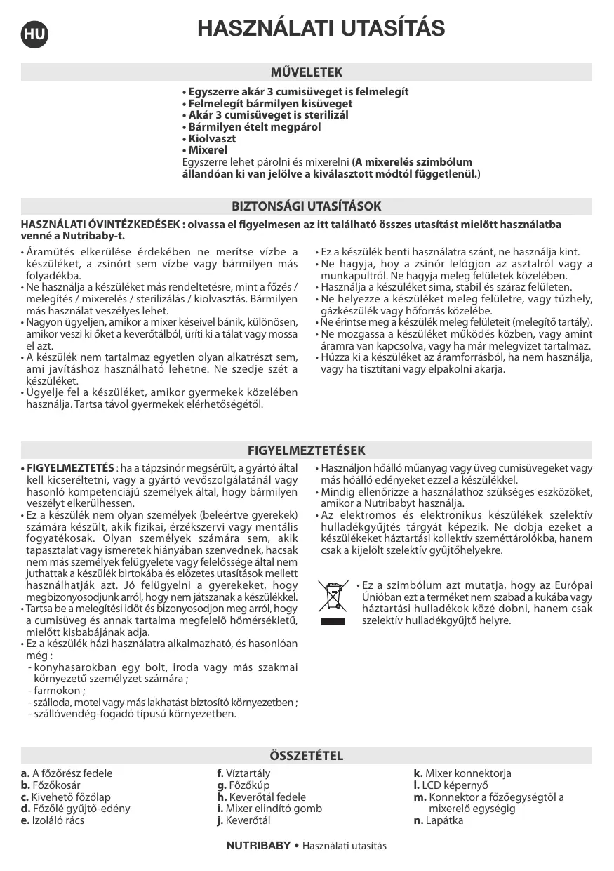 - des coins cuisines réservés au personnel dans les magasins, bureaux et autres environnements professionnels, - des fermes, - l’utilisation par les clients des hôtels, motels et autres environnements à caractère résidentiel, - des environnements du type de chambres d’hôtes. • Utilisez des biberons en plastique ou en verre pouvant bouillir ou tous autres récipients thermorésistants avec cet appareil. • Vérifiez toujours vos ustensiles avant de les employer avec le Nutribaby. • Les équipements électriques et électroniques font l’objet d’une collecte sélective. Ne pas se débarrasser des déchets d’équipements électriques et électroniques avec les déchets municipaux non triés, mais procéder à leur collecte sélective. • Ce symbole indique à travers l’Union Européenne que ce produit ne doit pas être jeté à la poubelle ou mélangé aux ordures ménagères, mais faire l’objet d’une collecte sélective.
