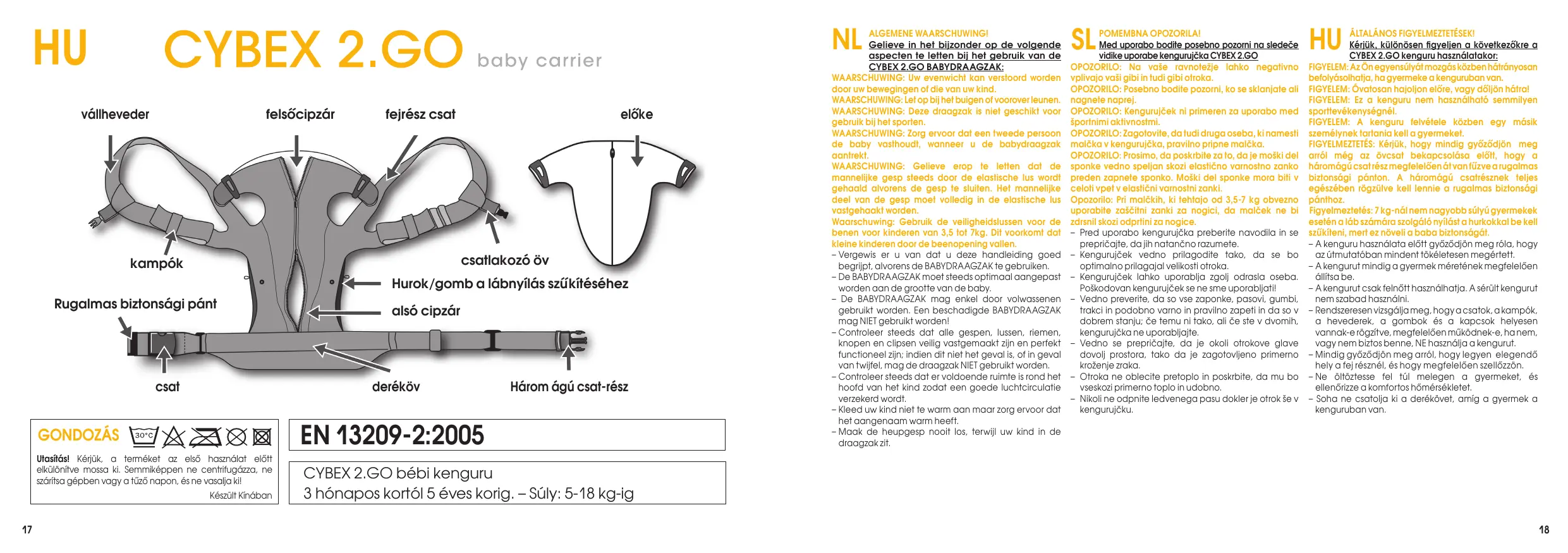 ÁLTALÁNOS FIGYELMEZTETÉSEK! Kérjük, különösen figyeljen a következőkre a CYBEX 2.GO kenguru használatakor: FIGYELEM: Az Ön egyensúlyát mozgás közben hátrányosan befolyásolhatja, ha gyermeke a kenguruban van. FIGYELEM: Óvatosan hajoljon előre, vagy dőljön hátra! FIGYELEM: Ez a kenguru nem használható semmilyen sporttevékenységnél. FIGYELEM: A kenguru felvétele közben egy másik személynek tartania kell a gyermeket. FIGYELMEZTETÉS: Kérjük, hogy mindig győződjön meg arról még az övcsat bekapcsolása előtt, hogy a háromágú csat rész megfelelően át van fűzve a rugalmas biztonsági pánton. A háromágú csatrésznek teljes egészében rögzülve kell lennie a rugalmas biztonsági pánthoz. Figyelmeztetés: 7 kg-nál nem nagyobb súlyú gyermekek esetén a láb számára szolgáló nyílást a hurkokkal be kell szűkíteni, mert ez növeli a baba biztonságát. – A kenguru használata előtt győződjön meg róla, hogy az útmutatóban mindent tökéletesen megértett. – A kengurut mindig a gyermek méretének megfelelően állítsa be. – A kengurut csak felnőtt használhatja. A sérült kengurut nem szabad használni. – Rendszeresen vizsgálja meg, hogy a csatok, a kampók, a hevederek, a gombok és a kapcsok helyesen vannak-e rögzítve, megfelelően működnek-e, ha nem, vagy nem biztos benne, NE használja a kengurut. – Mindig győződjön meg arról, hogy legyen elegendő hely a fej résznél, és hogy megfelelően szellőzzön. – Ne öltöztesse fel túl melegen a gyermeket, és ellenőrizze a komfortos hőmérsékletet. – Soha ne csatolja ki a derékövet, amíg a gyermek a kenguruban van.