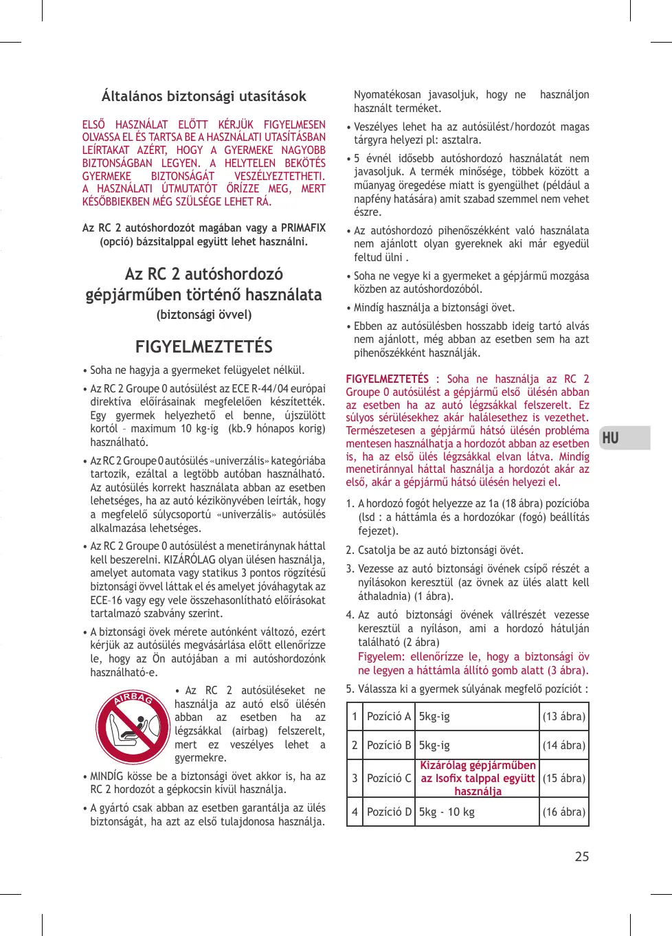 • El largo de los cinturones de seguridad varía según cada modelo de automóvil. Sugerimos que compruebe que esta silla grupo 0 puede utilizarse en su vehículo. • La silla Grupo 0 RC 2 nunca debe situarse en asientos delanteros equipados con “airbag”, esto podría ser muy peligroso. • Asegure SIEMPRE a su bebé con el arnés de seguridad de la silla Grupo 0 RC 2 aún si no la utiliza en el automóvil. • El fabricante sólo puede garantizar la seguridad de la silla grupo 0 cuando es utilizado por el primer propietario. Sugerimos que no utilice un