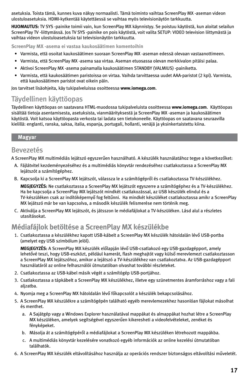 - Varmista, että kaukosäätimen paristoissa on virtaa. Vaihda tarvittaessa uudet AAA-paristot (2 kpl). Varmista, että kaukosäätimen paristot ovat oikein päin. Jos tarvitset lisäohjeita, käy tukipalveluissa osoitteessa www.iomega.com. Täydellinen käyttöopas Täydellinen käyttöopas on saatavana HTML-muodossa tukipalveluista osoitteessa www.iomega.com. Käyttöopas sisältää tietoja asentamisesta, asetuksista, vianmäärityksestä ja ScreenPlay MX -aseman ja kaukosäätimen käytöstä. Voit katsoa käyttöopasta verkosta tai ladata sen tietokoneelle. Käyttöopas on saatavana seuraavilla kielillä: englanti, ranska, saksa, italia, espanja, portugali, hollanti, venäjä ja yksinkertaistettu kiina. Bevezetés A ScreenPlay MX multimédiás lejátszó egyszerűen használható. A készülék használatához tegye a következőket: A. Fájlátvitel kezdeményezéséhez és a multimédiás könyvtár rendezéséhez csatlakoztassa a ScreenPlay MX lejátszót a számítógéphez. B. Kapcsolja ki a ScreenPlay MX lejátszót, válassza le a számítógépről és csatlakoztassa TV-készülékhez. MEGJEGYZÉS: Ne csatlakoztassa a ScreenPlay MX lejátszót egyszerre a számítógéphez és a TV-készülékhez. Ha be kapcsolja a ScreenPlay MX lejátszót mindkét csatlakozással, az USB készülék elindul és a TV-készüléken csak az indítóképernyő fog feltűnni. Ha mindkét készüléket csatlakoztassa amikr a ScreenPlay MX lejátszó már be van kapcsolva, a második készülék felismerése nem történik meg. C. Aktiválja a ScreenPlay MX lejátszót, és játsszon le médiafájlokat a TV-készüléken. Lásd alul a részletes utasításokat. Médiafájlok betöltése a ScreenPlay MX készülékbe
