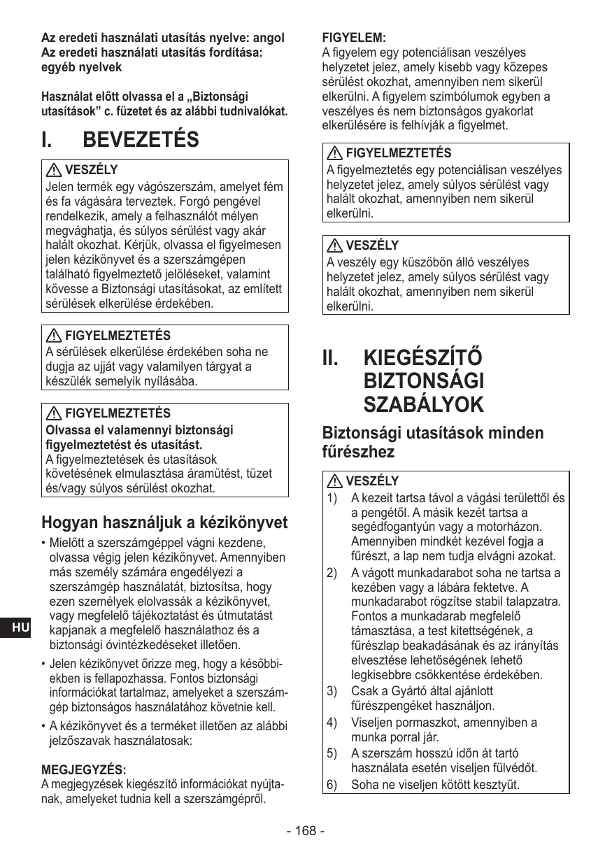 Jelen termek egy vagoszerszám, amelyet fém és fa vagensára terveztek. Forgo pengével rendelkezik, amely a felhasznalót melyen megvághatja, és súlyos sérulést vagy akár halál't okozhat. Kérjuk, olvassa el figyelmesen jelen kézikonyvet és szerszámgepen talalhato figyelmeztető jalöseket, valamint kõvesse a Biztonsági utasításokat, az emlitettsérulések elkerulése erdekében.