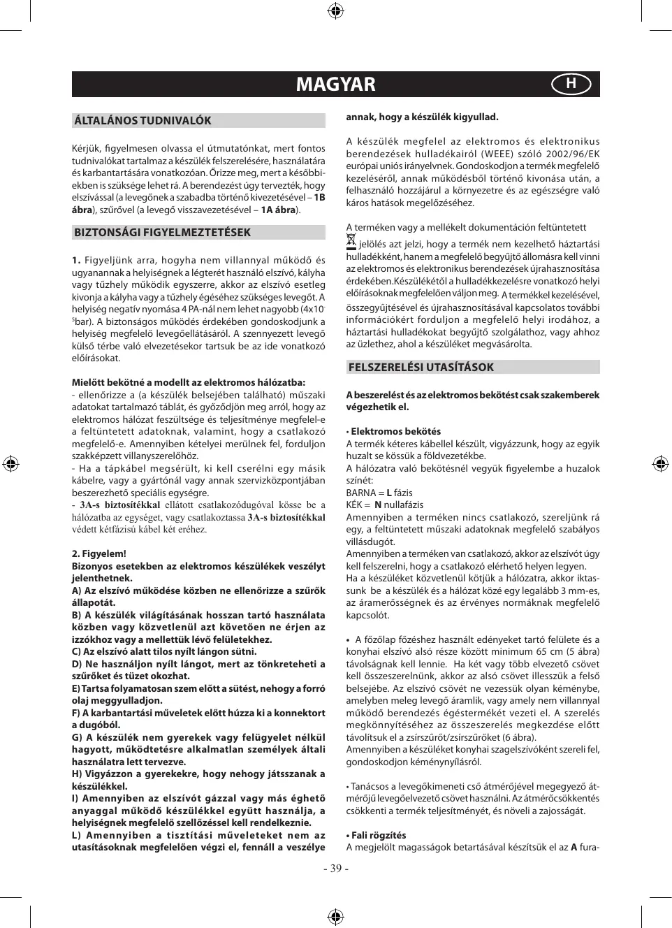 Avant de brancher la hotte au réseau de distribution électrique: - lire les données reportées sur la plaquette d’identification (appliquée à l’intérieur de la hotte) pour vérifier si le voltage et la puissance correspondent à ceux du réseau. Contrôler aussi si la prise est adaptée. - En cas de doutes, contacter un électricien qualifié. Si le câble d’alimentation est abîmé, il faut le remplacer par un autre câble ou par un ensemble, spécialement prévus, que vous pouvez commander au fabricant ou à un de ses services d’assistance technique. - Raccorder le dispositif au secteur à l’aide d’une prise avec fusible 3A ou aux deux fils du diphasé protégés par un fusible 3A. 2. Attention ! Dans certaines circonstances les électroménagers peuvent être dangereux. A) N’essayez pas de contrôler l’état des filtres quand la hotte est en marche. B) Ne jamais toucher les lampes et les zones adjacentes, pendant et tout de suite après l’utilisation prolongée de l’éclairage. C) Il est absolument interdit de flamber sous la hotte. D) Évitez de laisser des flammes libres, elles sont dangereuses pour les filtres et pour les risques d’incendie. E) Surveillez constamment les fritures pour éviter que l’huile surchauffée prenne feu. F) Avant de procéder à toute opération d’entretien, coupez l’alimentation électrique de la hotte. G) Cet appareil ne peut pas être utilisé par des enfants ou par des personnes nécessitant une surveillance. H) Veillez à ce que les enfants ne jouent pas avec l’appareil. I) Lorsque la hotte est utilisée en présence d’appareils utilisant du gaz ou d’autres combustibles, la pièce doit être correctement ventilée.